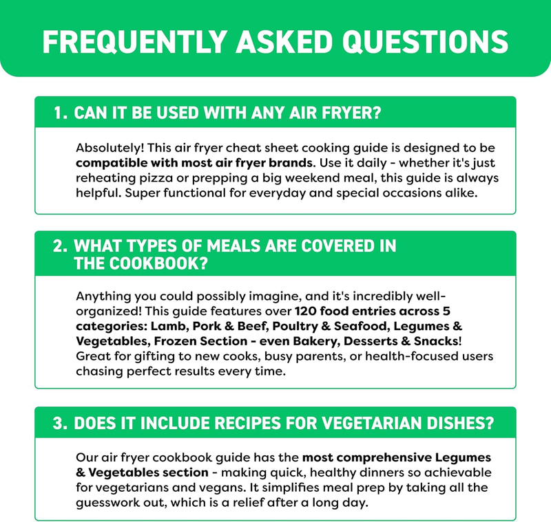 Comprehensive and Beginner-Friendly. Handy air fryer cookbook guide with 120+ foods across 5 categories, this air fryer cheat sheet magnet offers precise cooking times and temps for meats, veggies, snacks, and more. Designed for accessibility and quick reference, this kitchen gadget helps beginners master air fryer recipes effortlessly - perfect for healthier, faster daily meals.