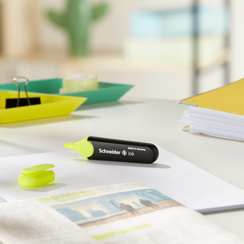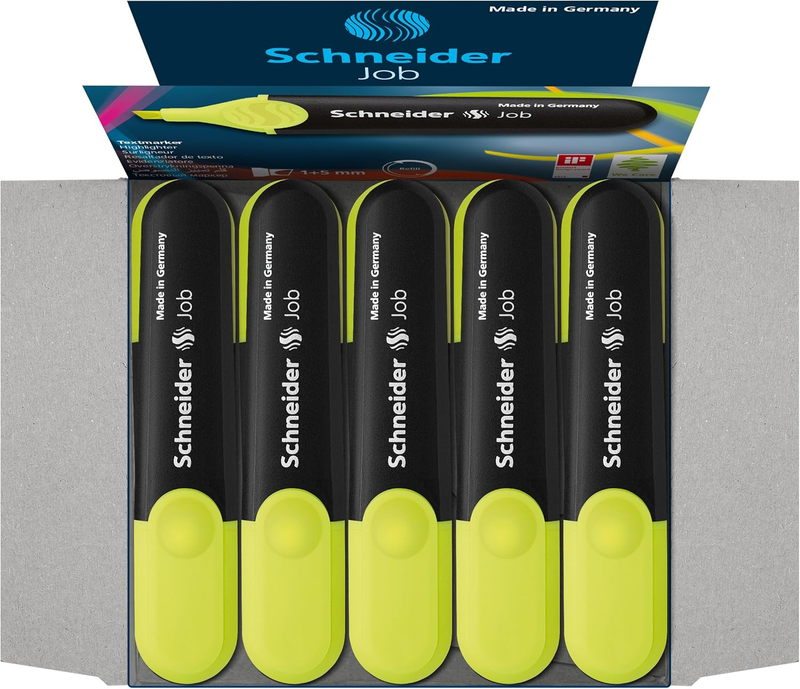 The Schneider Job Highlighter features intense color and light-resistant ink for maximum brilliance on standard, copy and fax paper. The chisel tip highlights in two line widths, 1 + 5 mm. The cap, with a practical and sturdy clip, fits neatly on the end of the barrel. The anti-evaporation, polypropylene barrel guarantees a longer shelf life with freshness for up to two years. With its large ink reservoir, the Job highlighter can highlight more than 15,000 words. Box of 10 highlighters. Ink color: Yellow. Made in Germany. Made in Germany, Schneider products are manufactured to the highest quality and environmental standards that have earned awards and accolades across the company's 80+ year history. Known for reliability, functionality and sustainability, Schneider Writing Instruments are available at excellent price points to empower creativity and pen to paper. Each thought is worth writing down - the Schneider way.