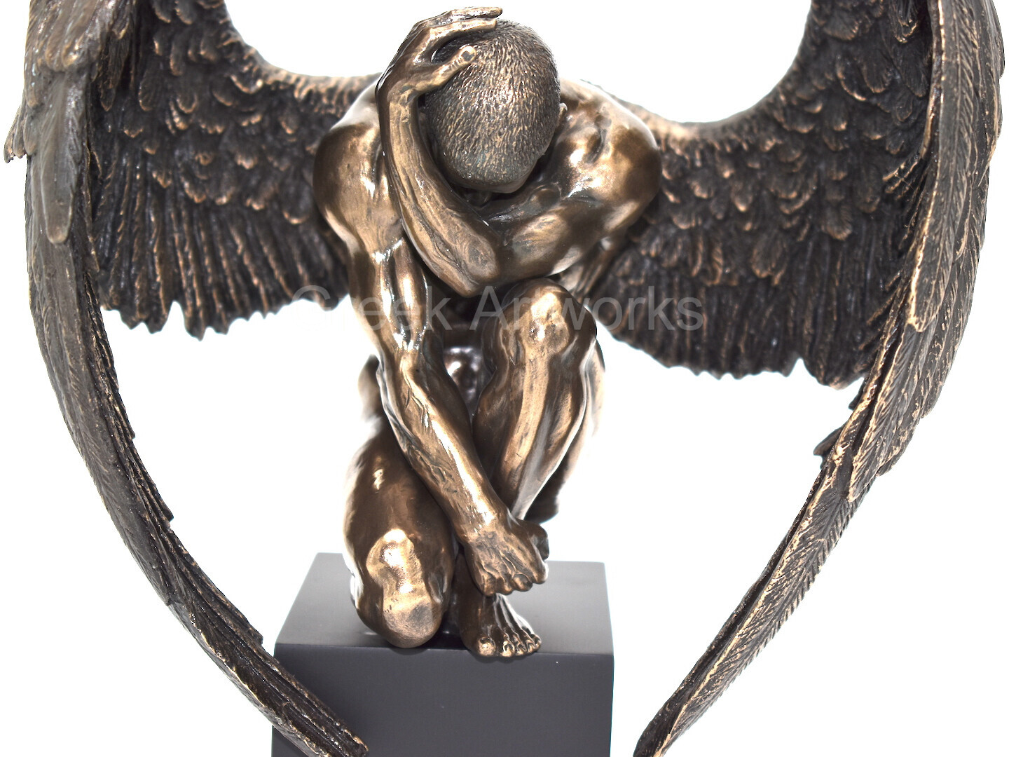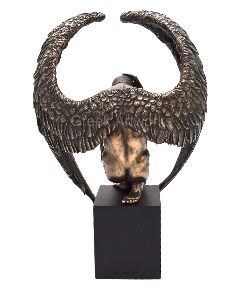 Winged Nude Male Angel Sitting on Plinth Bronze Finish Statue Sculpture Figure