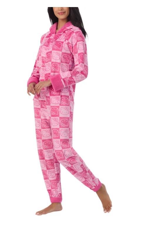 Hello Kitty Womens Pajama Pink One-Piece Hood Ears Pockets Fleece Plush Cozy