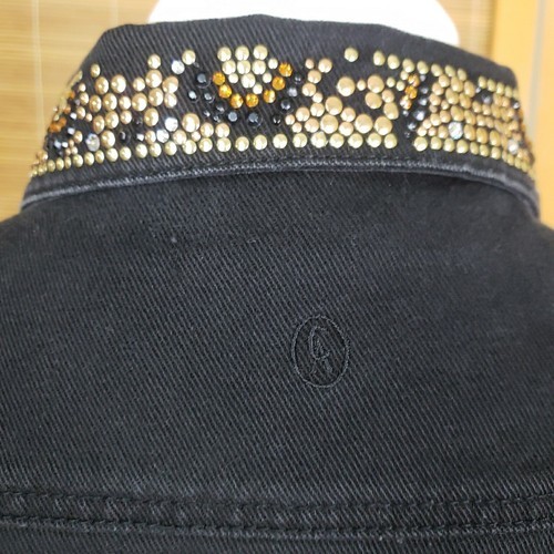 Beautiful Vintage Christine Alexander Denim Jacket with Swarovski Crystals layer out in a Leopard pattern with bronze and black studs