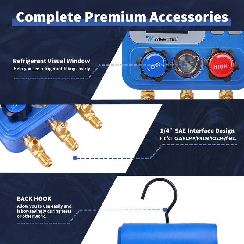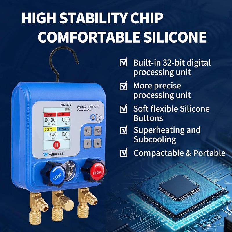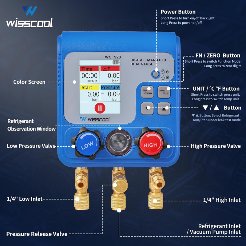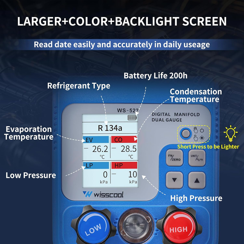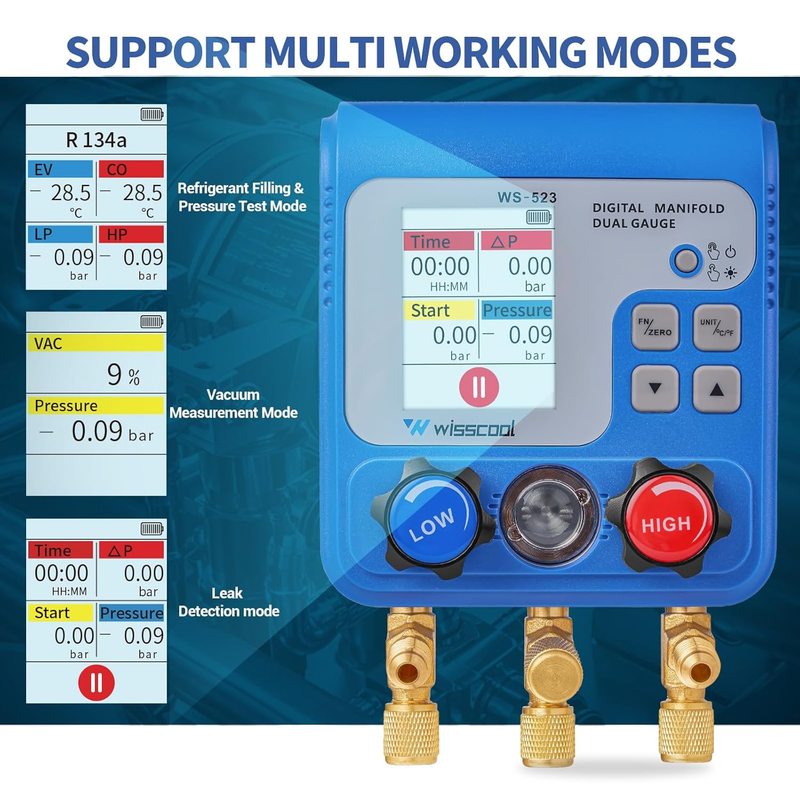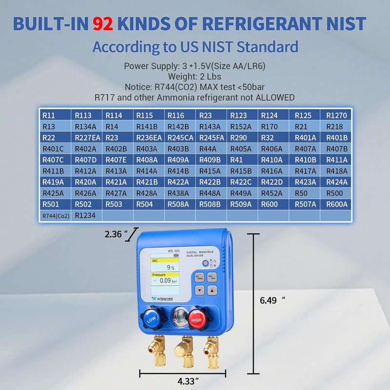 [VERSATILE REFRIGERANT COMPATIBILITY]? WISSCOOL digital manifold gauge combines three functions-Refrigerant filling pressure inspection, Vacuum pressure test and Leak detection. The single HVAC gauge tool can streamline refrigerant leak checks, deep vacuum pulls, and system performance evaluations without switching devices.It equiped with built-in data for 92 types of refrigerants and a 32-bit digital processing unit.