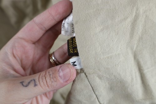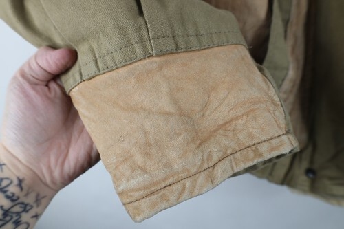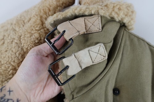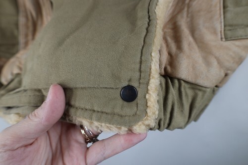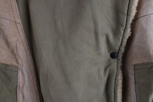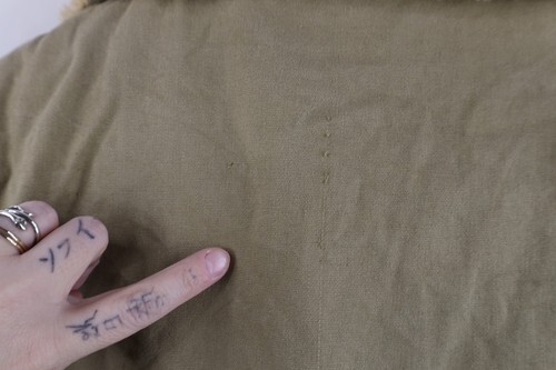 Blemishes, fabric pulls througout. Collar trim matted. Collar, cuffs, inner lining discolored. Color faded. Metal pieces collar tarnished
