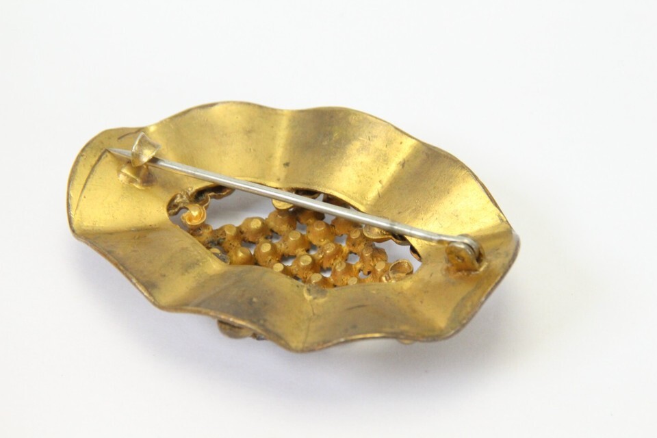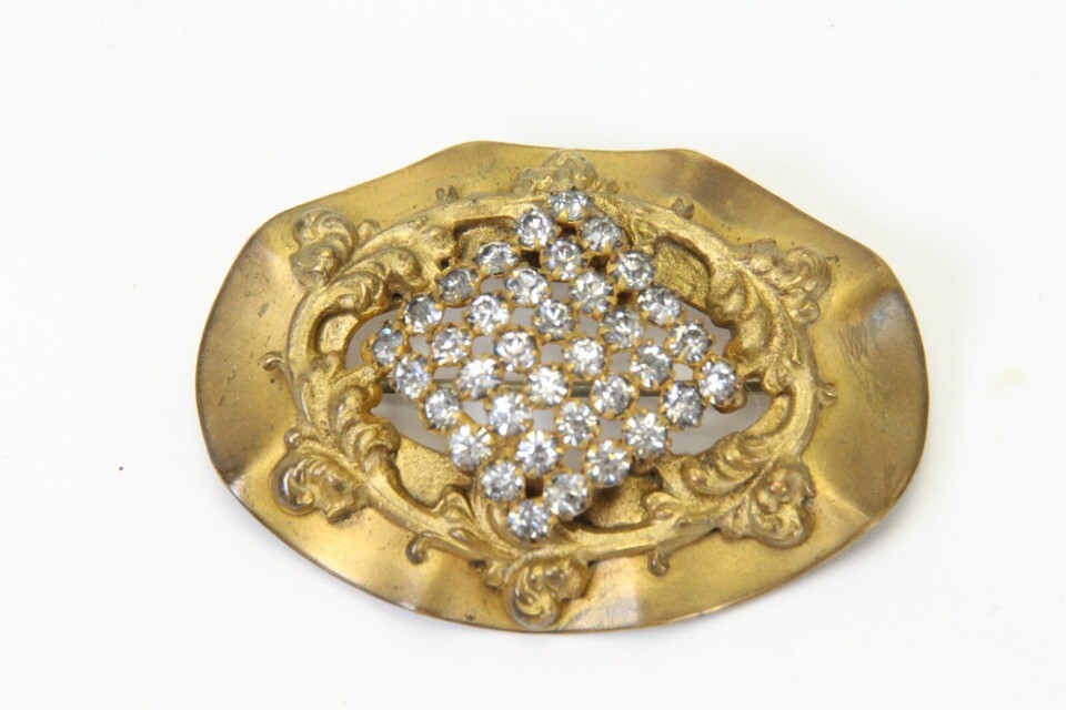 Victorian Revival Style Brushed Brass Rhinestone Sash Pin 2.5" x 1.75" x .6"