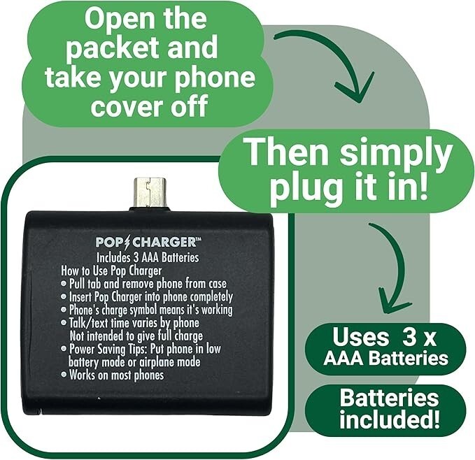 The Zorbitz Pop Charger is a convenient and disposable emergency cell phone charger designed to provide quick power when you need it most. Perfect for power outages, travel, camping, hiking, or any situation where your phone?s battery is low and you don?t have access to a regular charger. Keep a few Pop Chargers handy in your purse, car, and home for emergency situations.