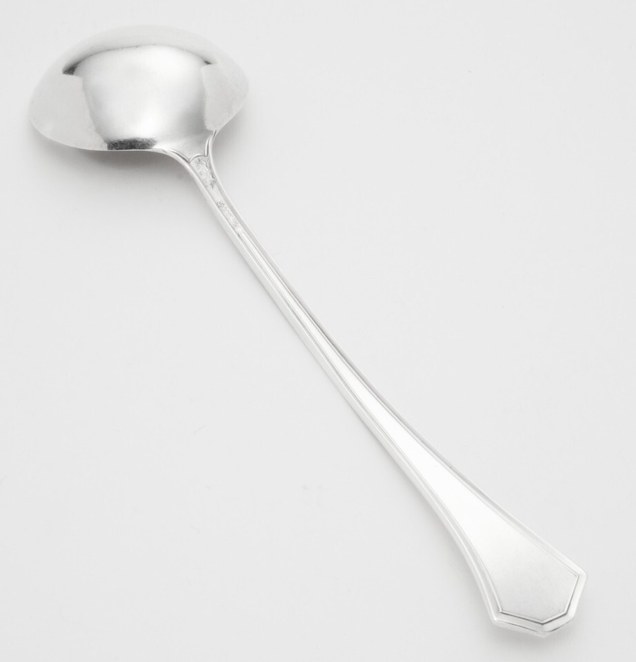 Description: Soup spoon (bouillon) Sterling silver, no monogram, reeded handle edge, round bowl.