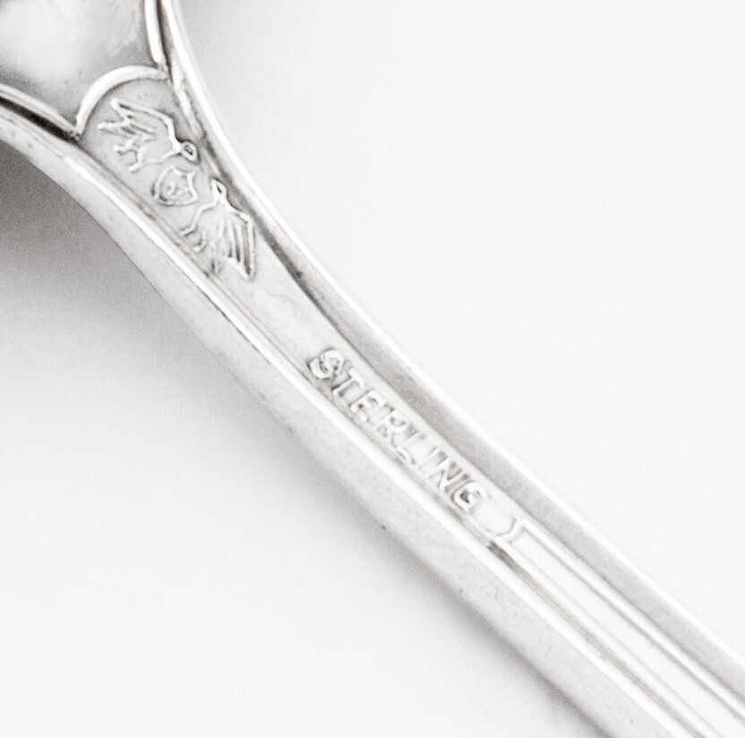 PIECE HAS A STAMPED HALLMARK " There is 1 symbol: 2 Birds looking a Shield and Sterling, it has a reeded edge on the handle of the spoon.