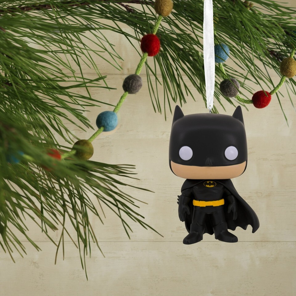 Christmas ornament features the Caped Crusader, Batman, in a scaled-down version of a signature DC Funko POP! design.