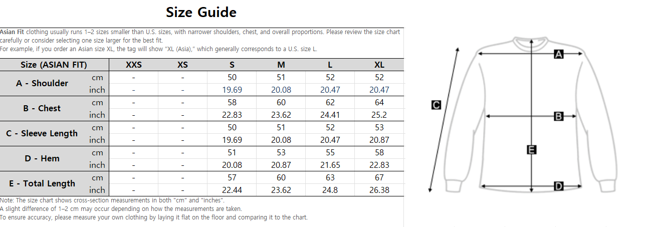 Asian Fit refers to clothing tailored for body shapes commonly found in Asian populations. These items typically run 1-2 sizes smaller than U.S. sizes, with narrower shoulders, chest, and overall proportions. Please check the size chart carefully or consider sizing up for the best fit.