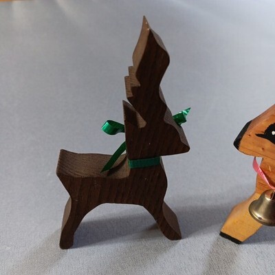 These handcrafted wooden reindeer figures are perfect for adding a touch of charm to your Christmas or holiday decor. Made by hand and measuring about 5 inches tall, these medium-sized figures are intricately carved and painted in a natural wood finish. The set of two figures features a brown color and depicts a deer fitting seamlessly into any room of your home. Whether for display on a shelf or tabletop, these unique and handmade collectibles are sure to bring a touch of nature into your holiday celebrations. Good condition with normal wear