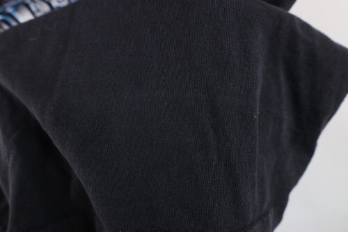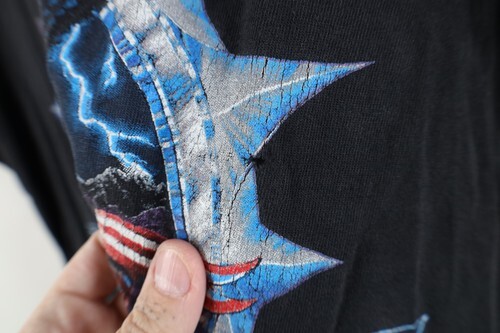 Holes front and back by graphics, collar, arms/armpits/sides. Collar, arms discolored. Blemishes/dark spots front, back. Graphics cracking/faded. Color faded. Pilling. Made in USA