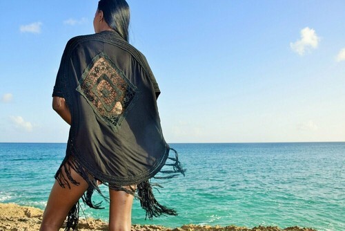 Add a touch of bohemian flair to your beach look with the Leana Paris Celia Cardigan. This black swimsuit coverup is perfect for the summer season, whether you're lounging by the pool or taking a stroll on the beach. The cardigan features beautiful crochet and lace accents, as well as tasseled and fringed details that give it a stylish yet relaxed feel.