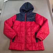 This Columbia insulated puffer jacket in red with navy accents is perfect for cold-weather wear. Sized Youth Large (14/16), it features quilted insulation, a brushed fleece upper lining, and a hood for extra warmth. Lightweight yet warm, it?s great for school, play, and outdoor adventures.