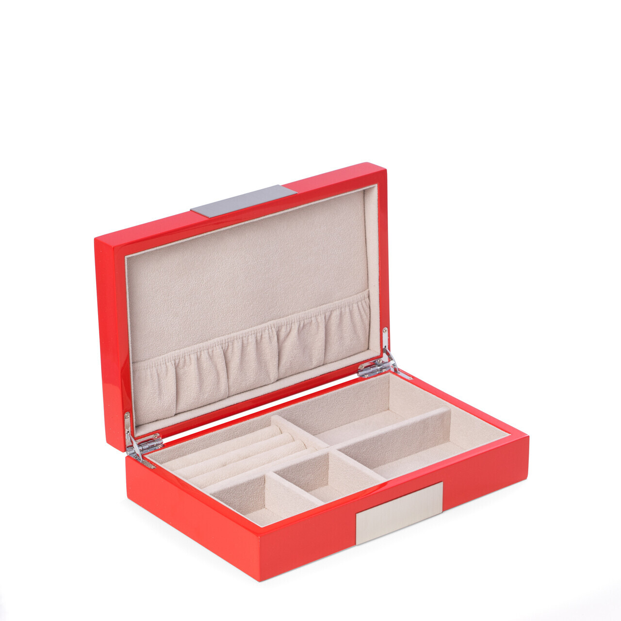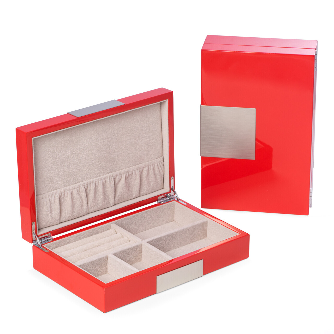 Lacquered "Red" Wood Valet Box with Stainless Steel Accents and Multi Compartments Storage.