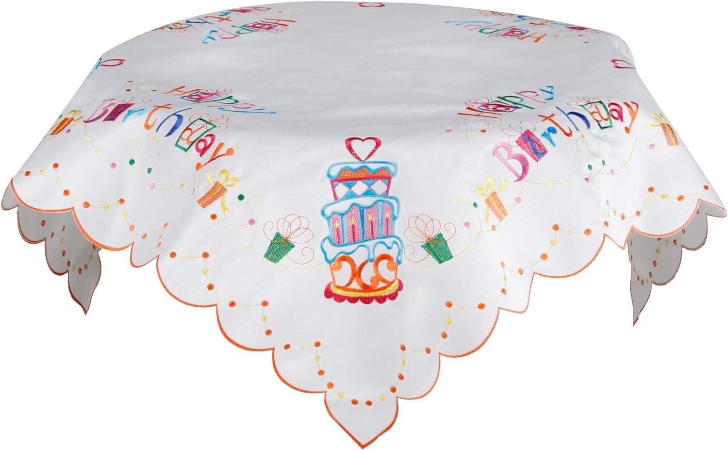 100% Polyester Bright Happy Birthday Party Decoration Cutwork Table Cover. Embroidered Birthday Cake Party Pattern Highlighting the Festive Cut Work. Perfect decoration for your table or dresser during a Birthday Celebration. 100% Hi-end Polyester. Easy care - Machine Washable, Low Iron for a Crisp Look.