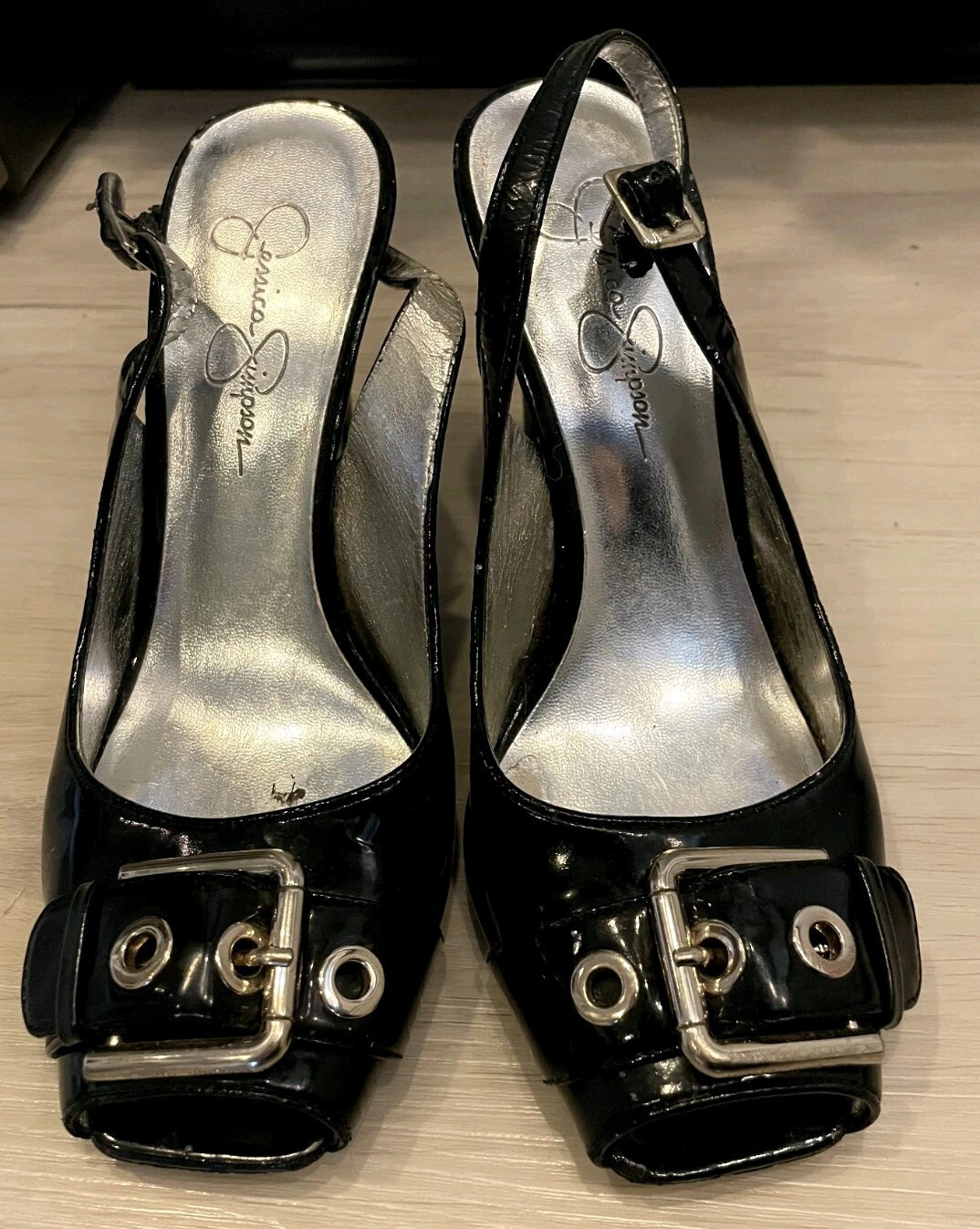 Heels Shoes By JESSICA SIMPSON - Size 7.5 - 8 Open Toe Black Leather Stylish