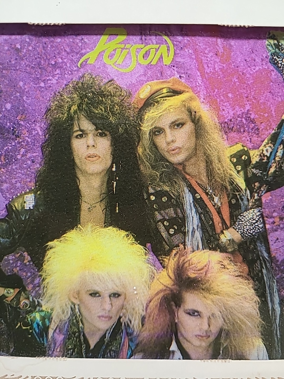 The product is a vintage 1980's Poison carnival game prize glass mirror featuring the iconic rock band Poison. This original piece of music memorabilia falls under the rock pop genre and would be a unique collectible for fans of the band. The mirrors are not typically associated with music memorabilia, making this item even more intriguing for collectors interested in music memorabilia from the 1980s.