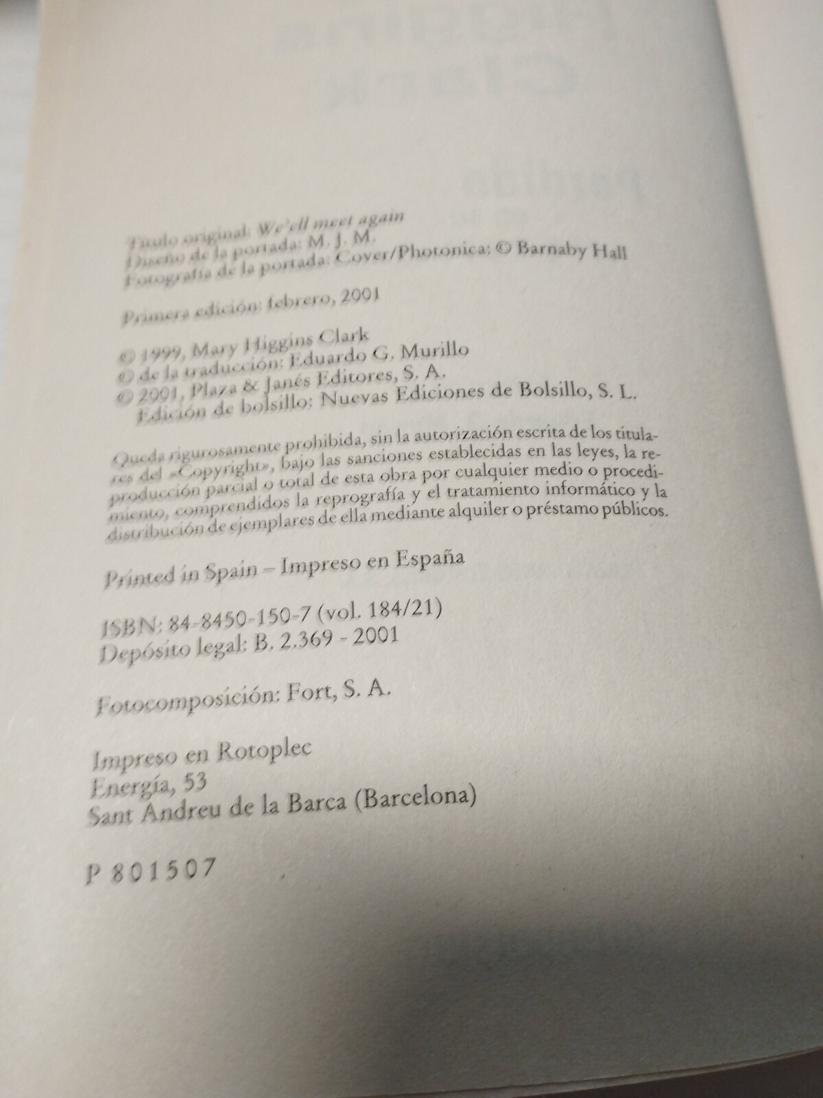 Perte dans Votre Mémoire Mary Higgins Clark P&j 2001 - Livre Espagnol Am