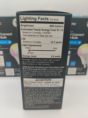 The product is a GE Cync Smart Bulb bundle, Dynamic FX Full Color A19 Wi-Fi that works with Alexa and Google.