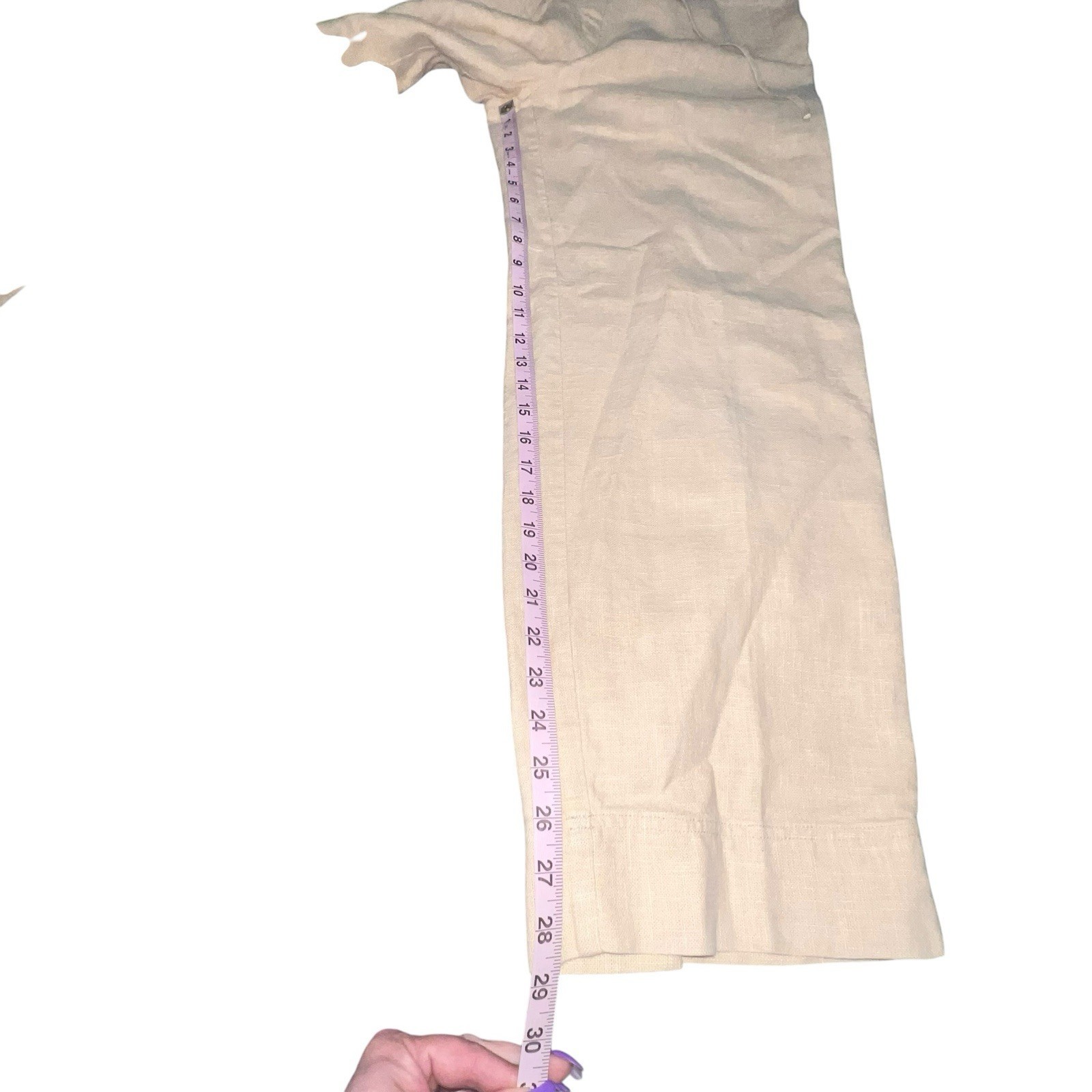 The product is a pair of Vintage Susan Bristol 100% Ramie Fabric Tan Straight Leg Drawstring Pants in size 10. These pants feature a solid beige color with a high-rise waist and a classic fit. The pants have a zip, button, and drawstring closure, making them suitable for travel and casual occasions. They are lightweight, comfortable, and breathable, with an ankle-length inseam of 27.5 inches. Perfect for women looking for a stylish and comfortable addition to their wardrobe, these pants have a retro and preppy vibe that can be ideal for various themes such as beach or bohemian styles.