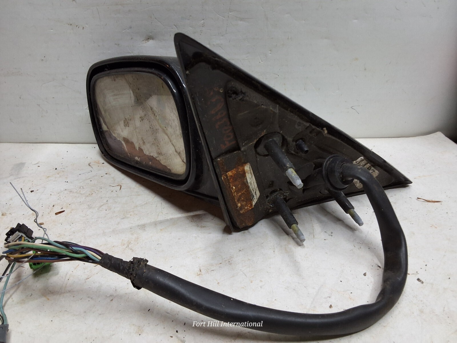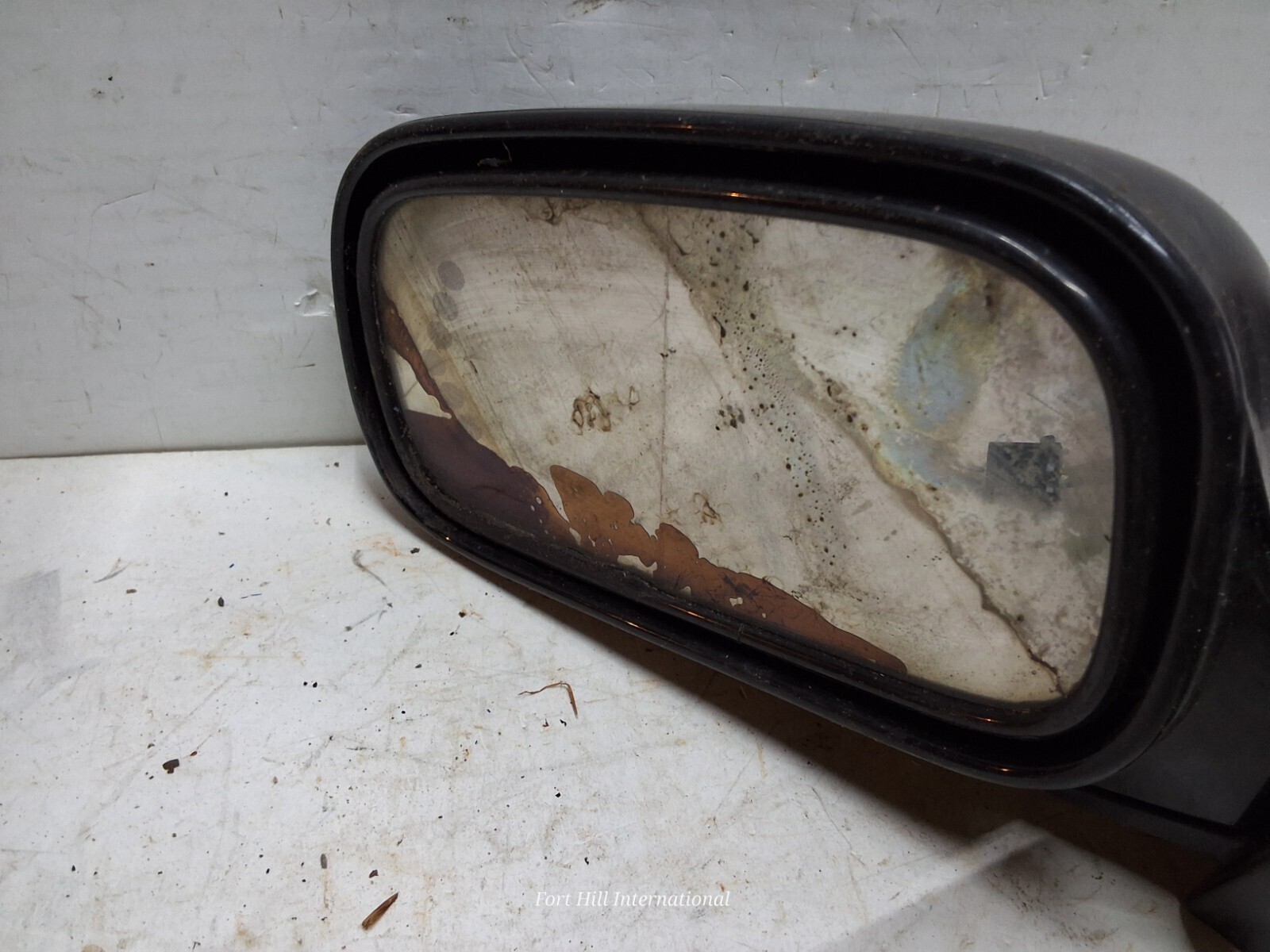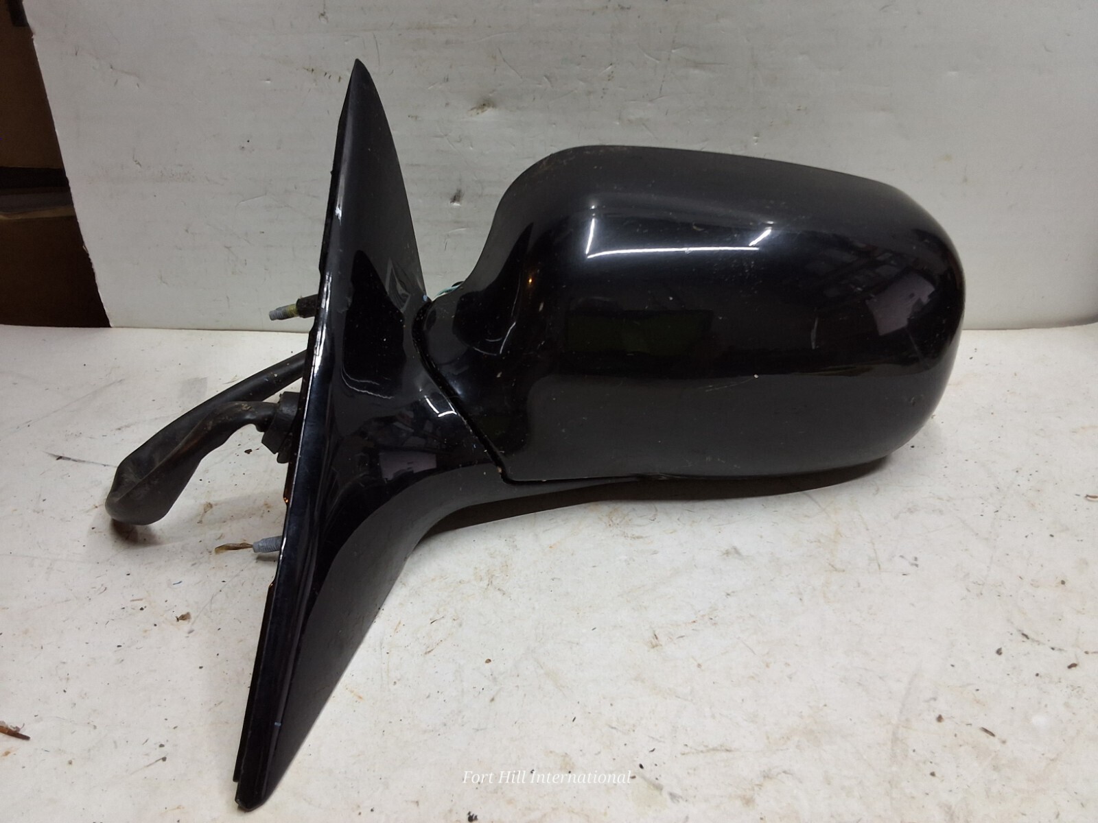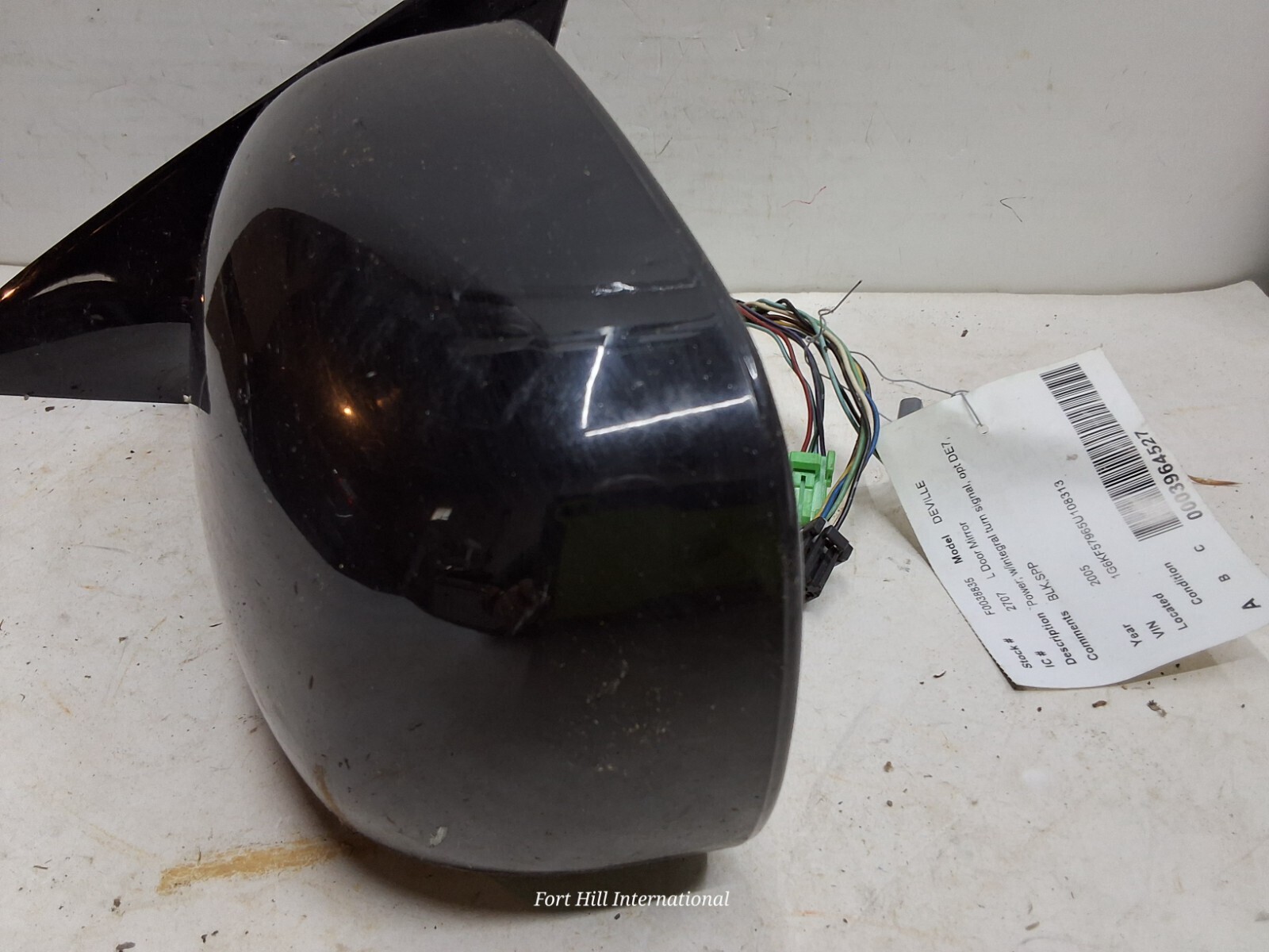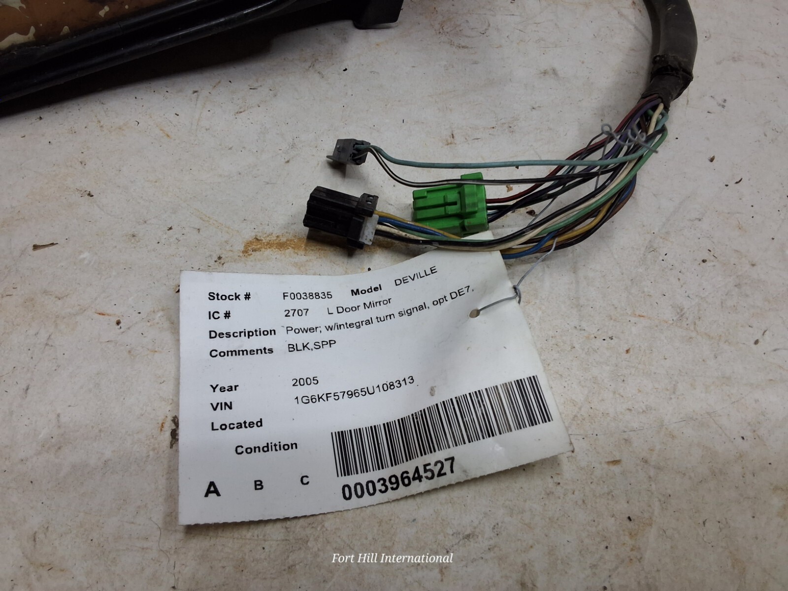 2003 through 2005 Cadillac DeVille left driver's black door mirror with integrated turn signal. 3 plugs grey has 2 wires, green has 4 wires, black has 8 wires. Glass has been delaminated and cracked and will need to be replaced.
