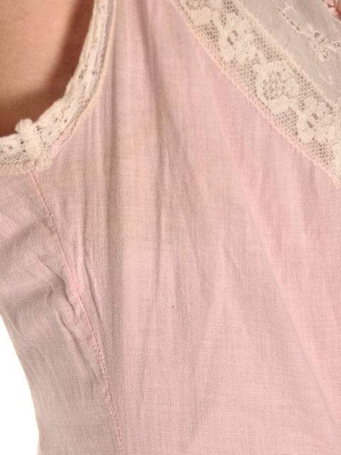 Pretty in pink, this antique vintage cotton chemise was worn over the corset and under the petticoats. It has the princess lines typical of the 1890s- 1910s. The antique chemise is trimmed lovely net lace, on the edges and in insets. The vintage chemise closes in back with tiny MOP buttons and has a covered placket. The front yoke has a white on white embroidery and pink drawstring style. Could be worn as a summer dress.