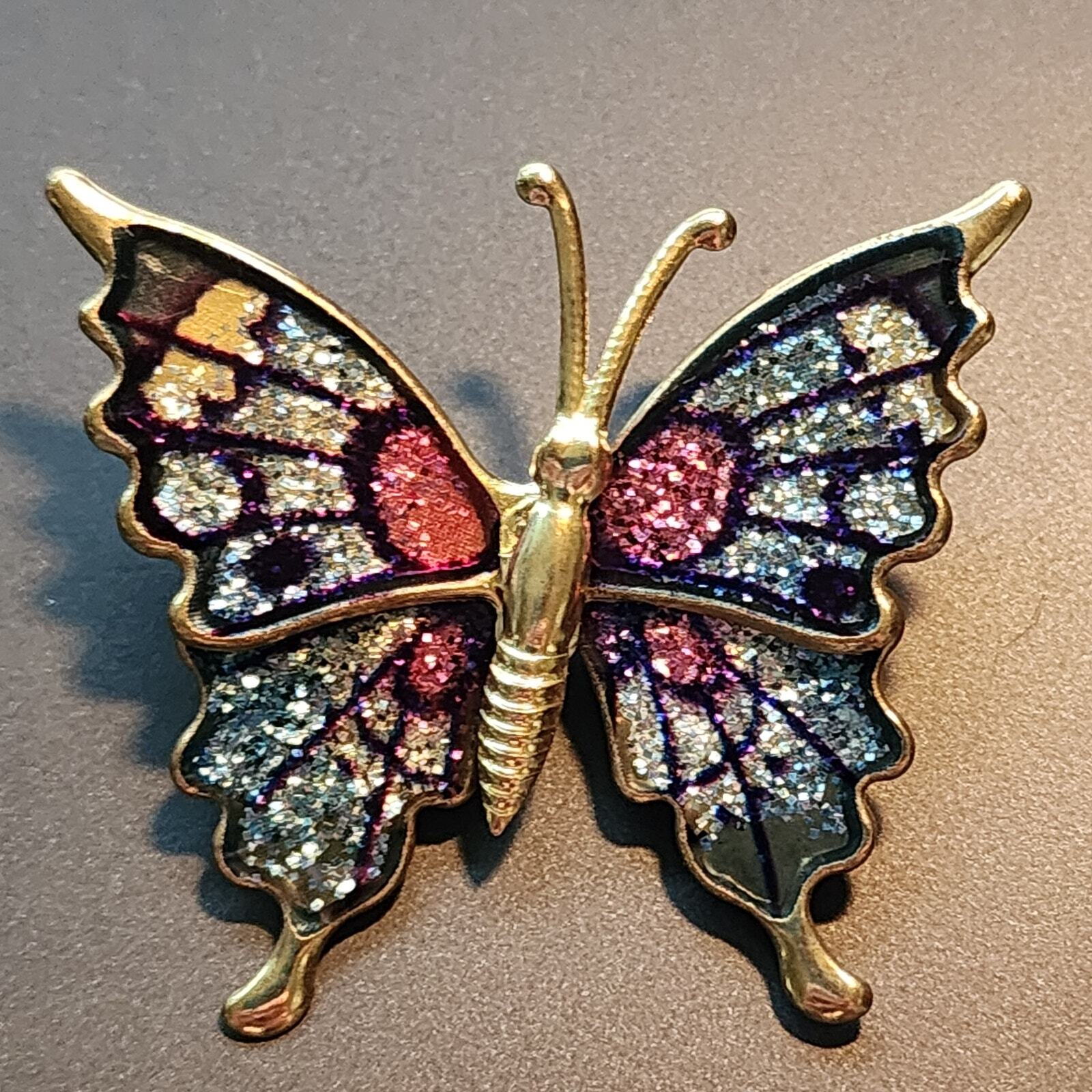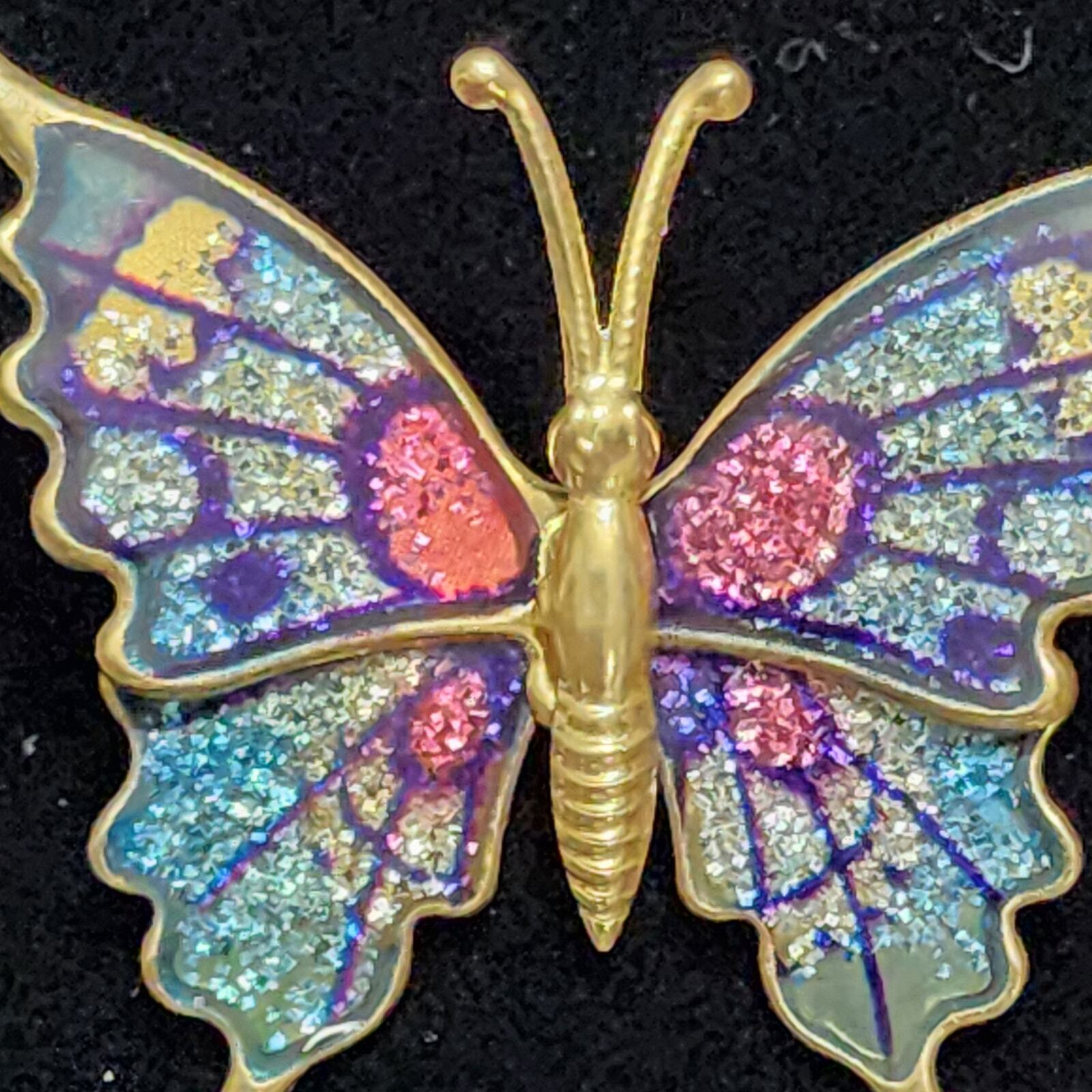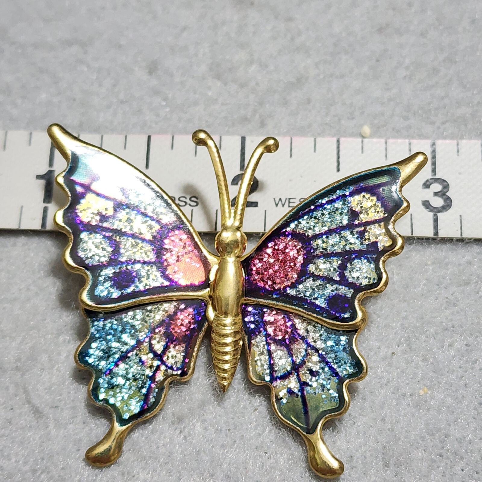 Butterfly Brooch Pin Gold Toned Brass Wiring And Glitter Enamel Design Vintage 1980's