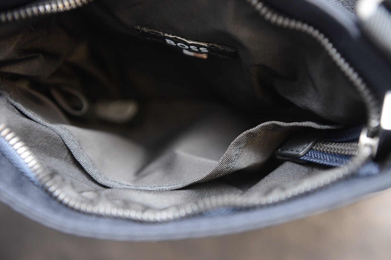 An envelop sling shoulder bag with bold BOSS logo on the front. The thin and easy-to-use size offers innovative designs that fit a wide variety of lifestyles, from suits to casual to sportswear. Front zippered accessory compartment, main zipper closure with interior divider. The length of the shoulder strap is adjustable. Max. strap length: 54". ? Color: Navy Blue ? Size (Approx.): 8.5" x 8.75" x 0.8" (21.5cm x 22.5cm x 2.0 cm).