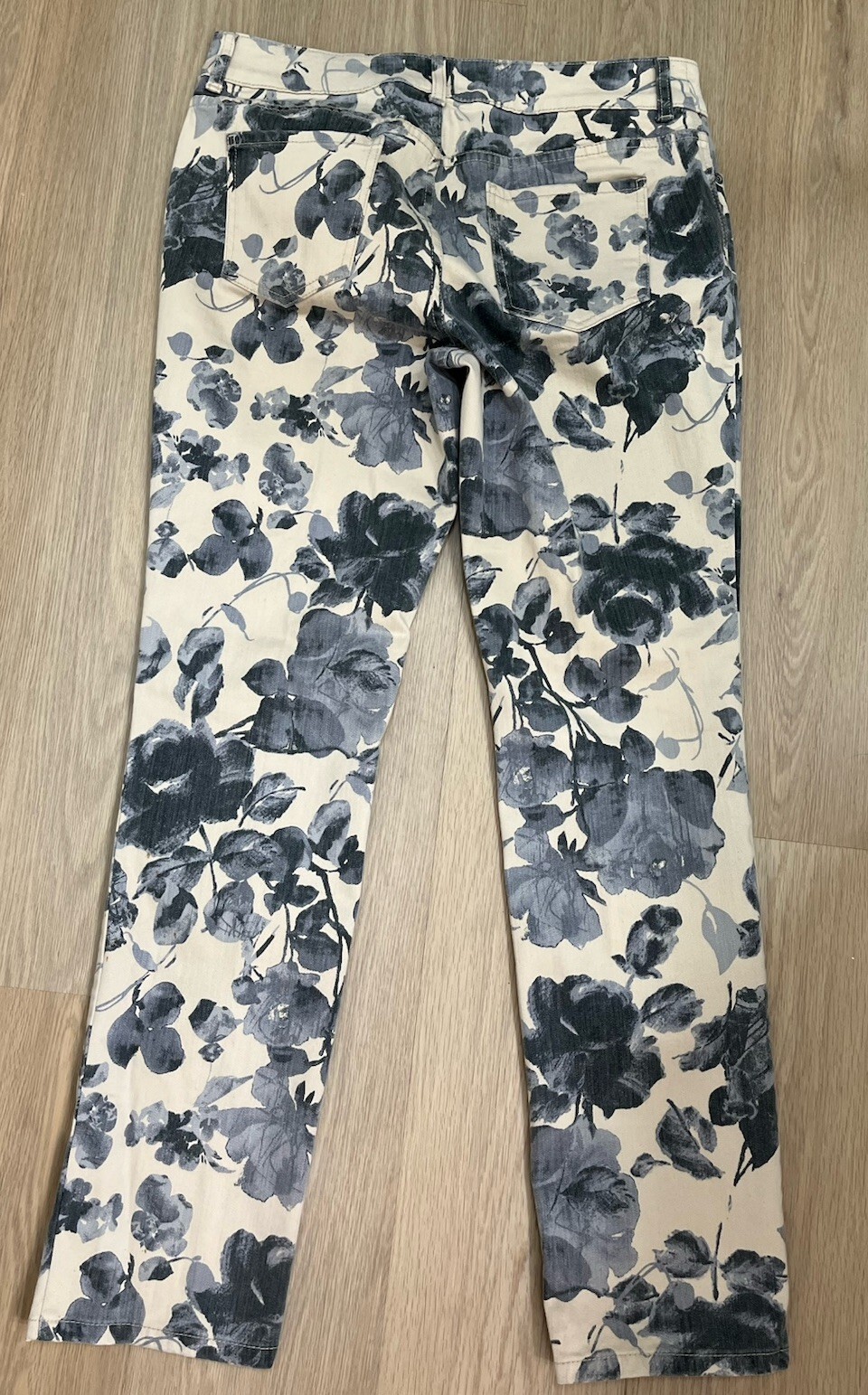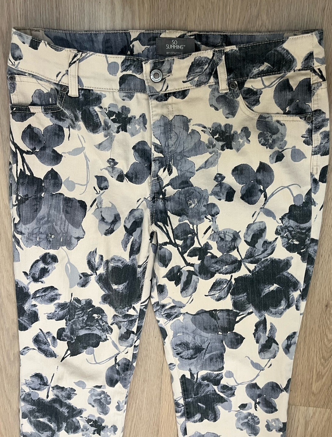 These Chicos So Slimming Floral Print Straight Leg Denim Jeans in size 1.5 Regular offer a stylish and flattering fit for women. The floral print adds a touch of personality to the classic denim fabric, while the mid-rise and straight leg style provide a slimming effect. With a zip and button closure, these cotton blend pants are both comfortable and practical for everyday wear. Perfect for adding a pop of color and pattern to your wardrobe, these jeans from Chico's are a versatile and trendy choice for any occasion.