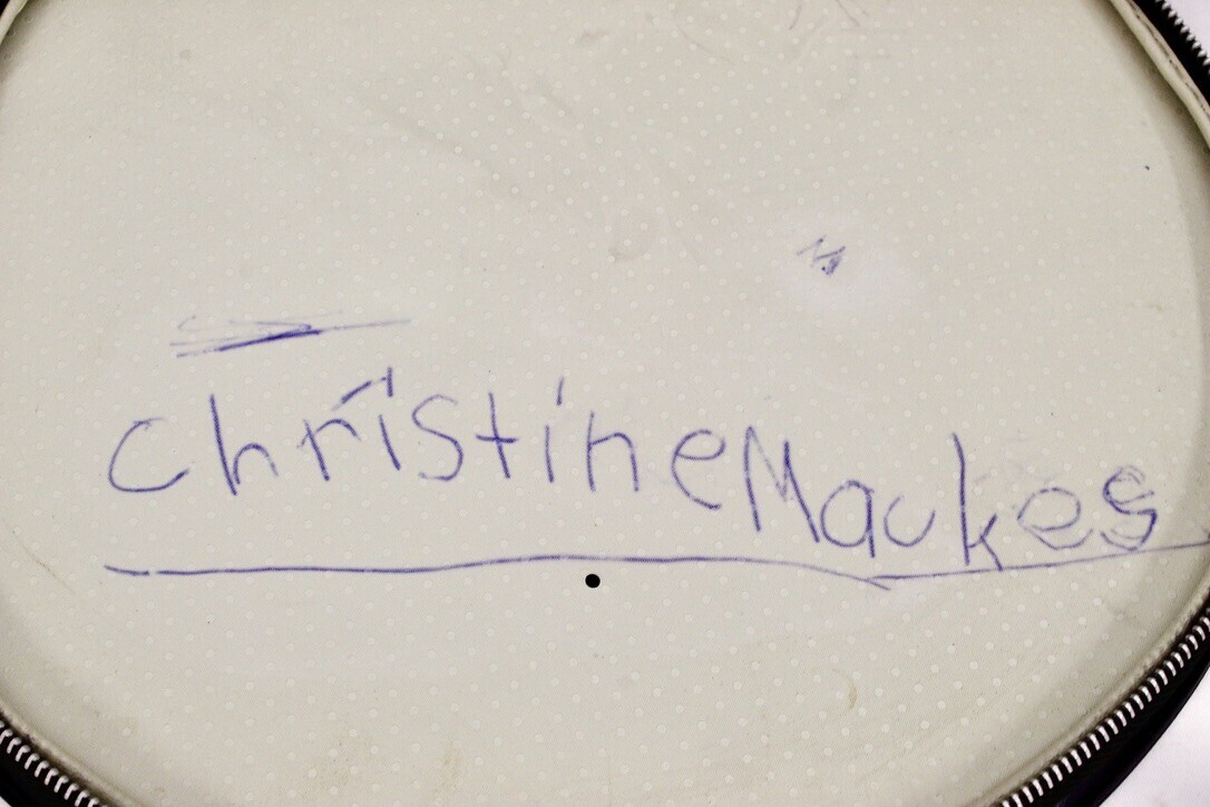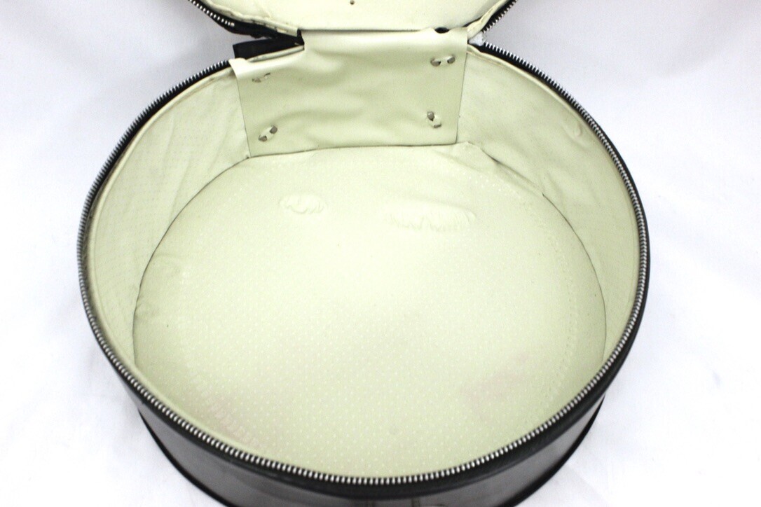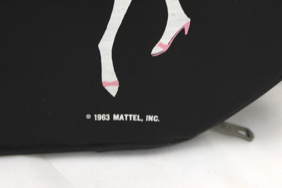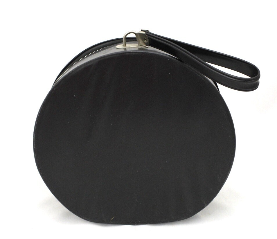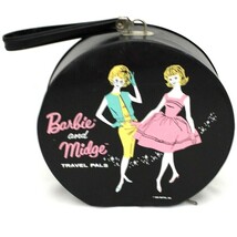 Adorable 1963 Round Black Vinyl Barbie and Midge Travel Pals Case would make the most darling purse! It is in great condition for it's age does have normal wear, couple rip's on the corners as shown in the pictures on the inside lid nothing major, scratches, some stains and needs a little cleaning. Has a small crack on bottom edge in back and CHRISTINE was very adept at inscribing her name inside with indelible ink!
