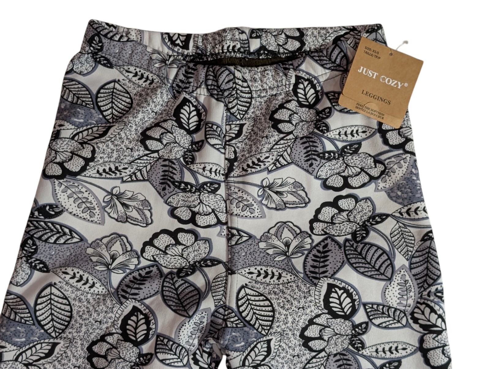 These are absolutely beautiful. Brand new. Get cozy boutique leggings. Size extra small/small. The interior is completely lined with super soft brushed fleece. They have a white background with black and gray floral design. The retail price is over $50