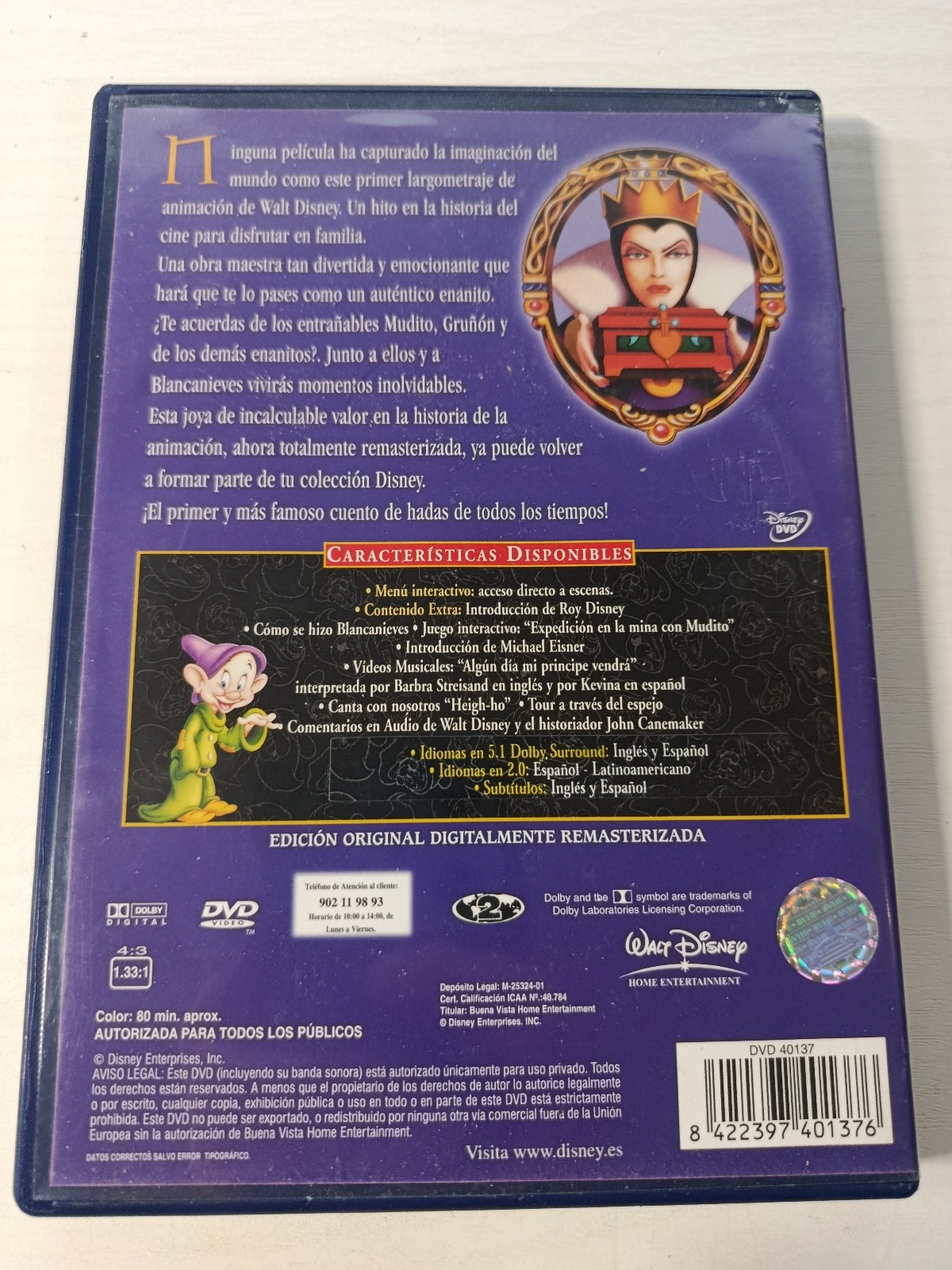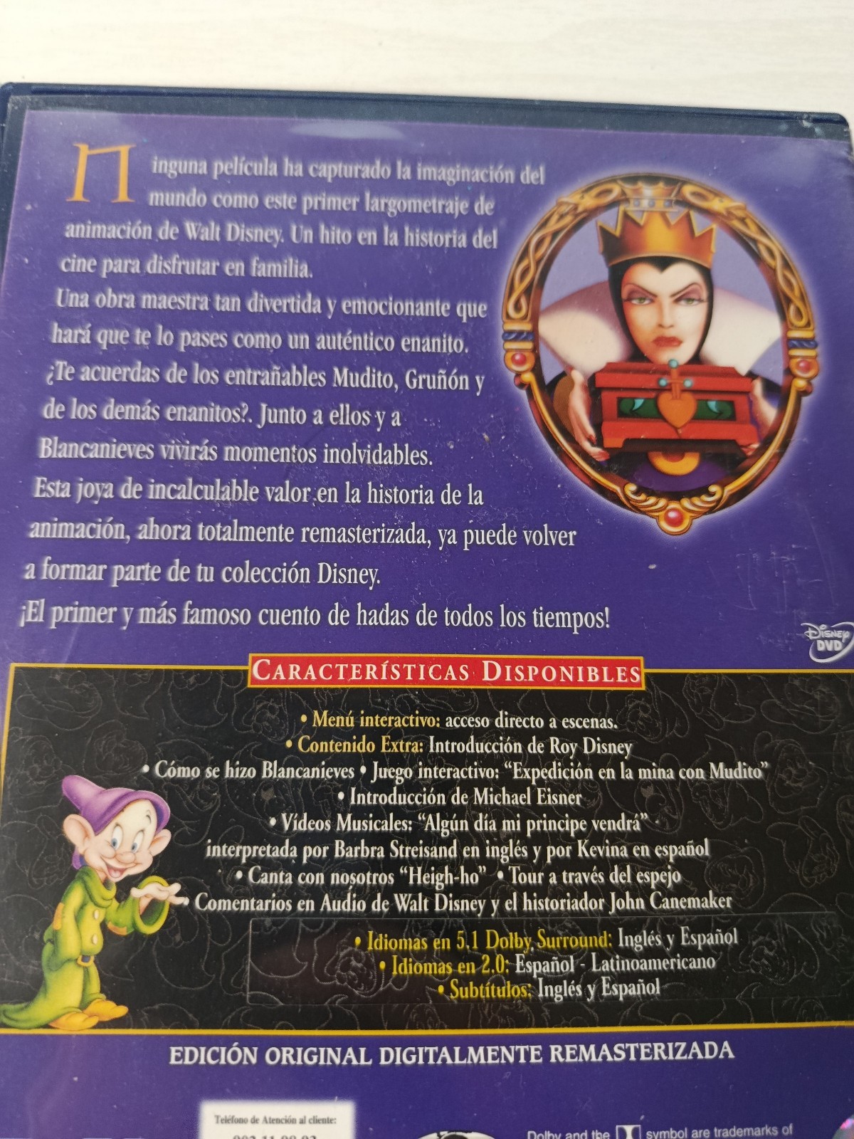 Edition remasterisee dans DVD del premier long metrage dedeWalt Disney , publie a l'origine en 1937. Blancanieves et los Siete nains es Un chef-d'?uvre universel que a marque la historiadel cinema, et cette edition offre une qualitede Image etsonido renouvele a cote du materiel exclusif supplementaire. Une piece essentielle para tout collectionneur de classiques et d'amants de Disneyde Animation traditionnelle. Nous sommes en Espagne et nous proposons des articles soigneusement selectionnes: Vinyle, VHS, DVD, cassettes, livres et objets de. Nous accordons une attention particuliere a l'Etat, a la rarete et a la presentation. Nous sommes bases en Espagne et proposons des articles soigneusement organises: Records vinyles, bandes VHS, DVD, cassettes, livres et objets de collection. Nous pren