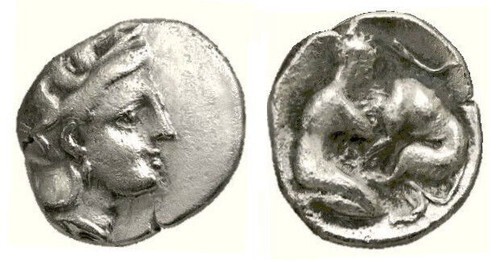 Obverse: Helmeted head of Athena right, with helmet decorated with hippocamp.