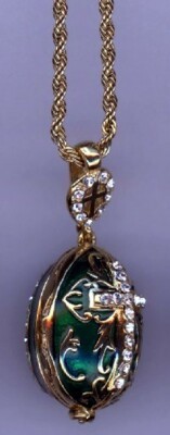 Background is Green, crystal cross, opens with a three piece set of like Madonna and Child in the middle with two sides with Scenes. The opened setup is shown for just one of five pendants, each can be seen just email for more photos. Contact for more. A beautiful Cross in Green, designed from Royal Russian Egg Pendant with Necklace 20 Inches This exquisite and artistically crafted egg pendant necklace brings elegance and sophistication with simple contrasts of color and texture. Its' charm is inspired from Russian royal egg pendants, and it's ready to complete most outfits! Attention Europe and Asia customers please be aware standard postage can take from 7-45 business days to arrive. If you need the item faster please select another mailing option. Please contact us with any questio
