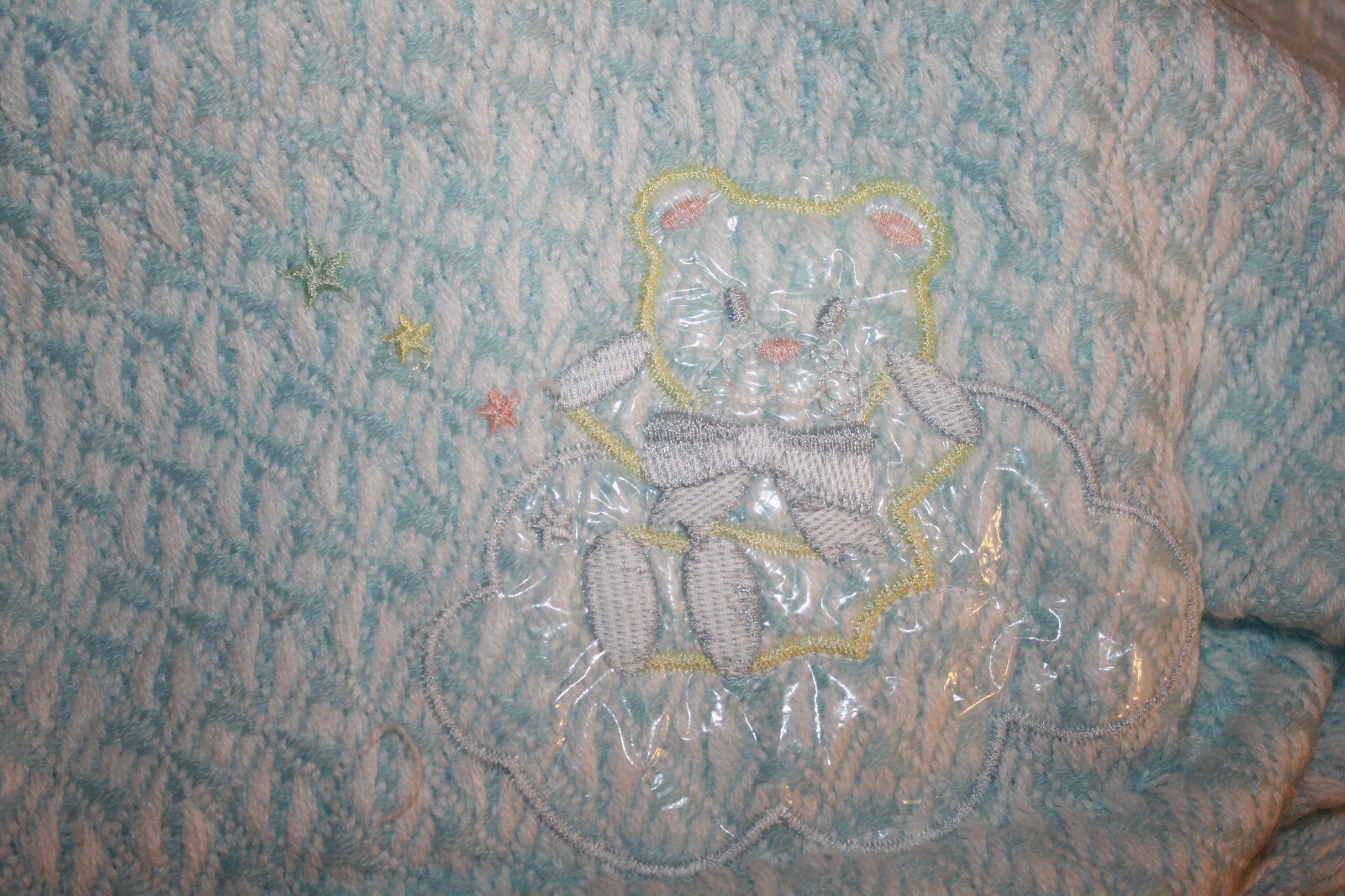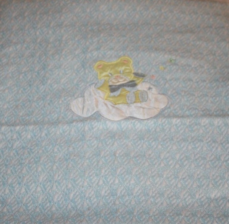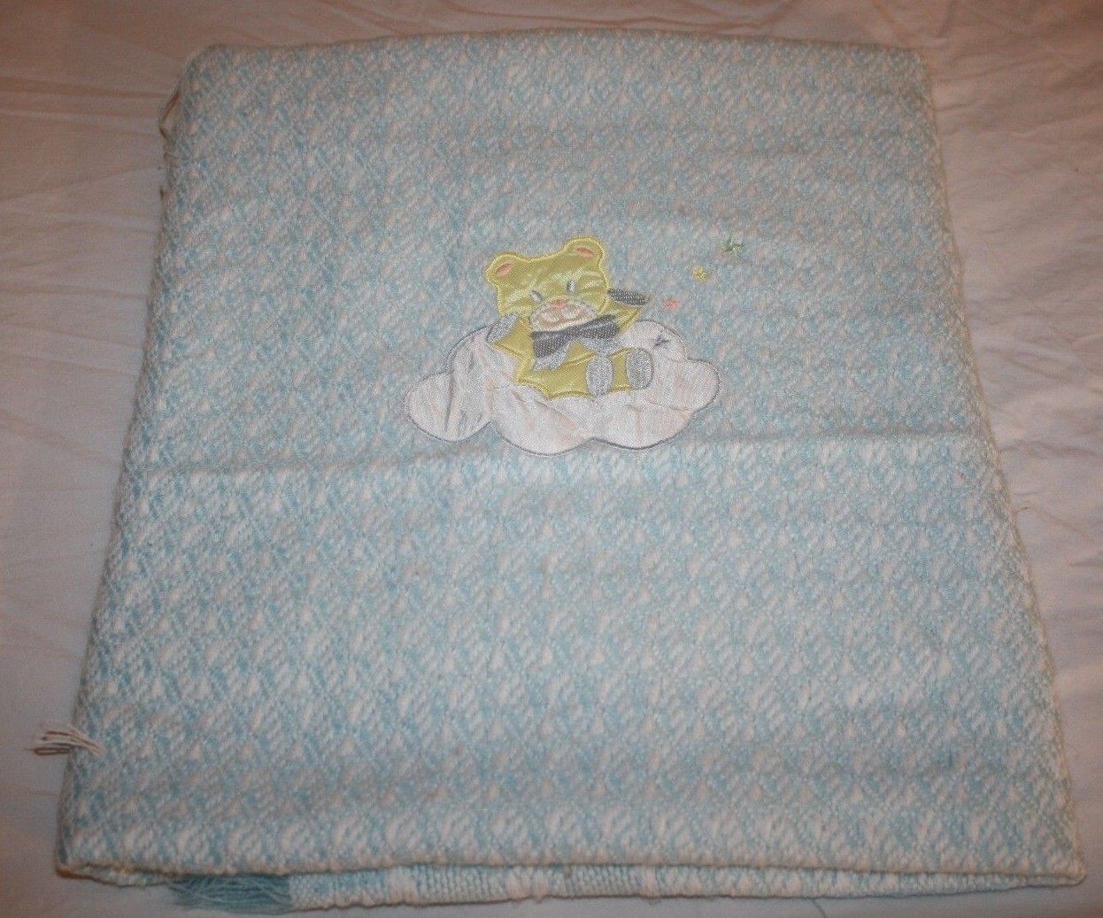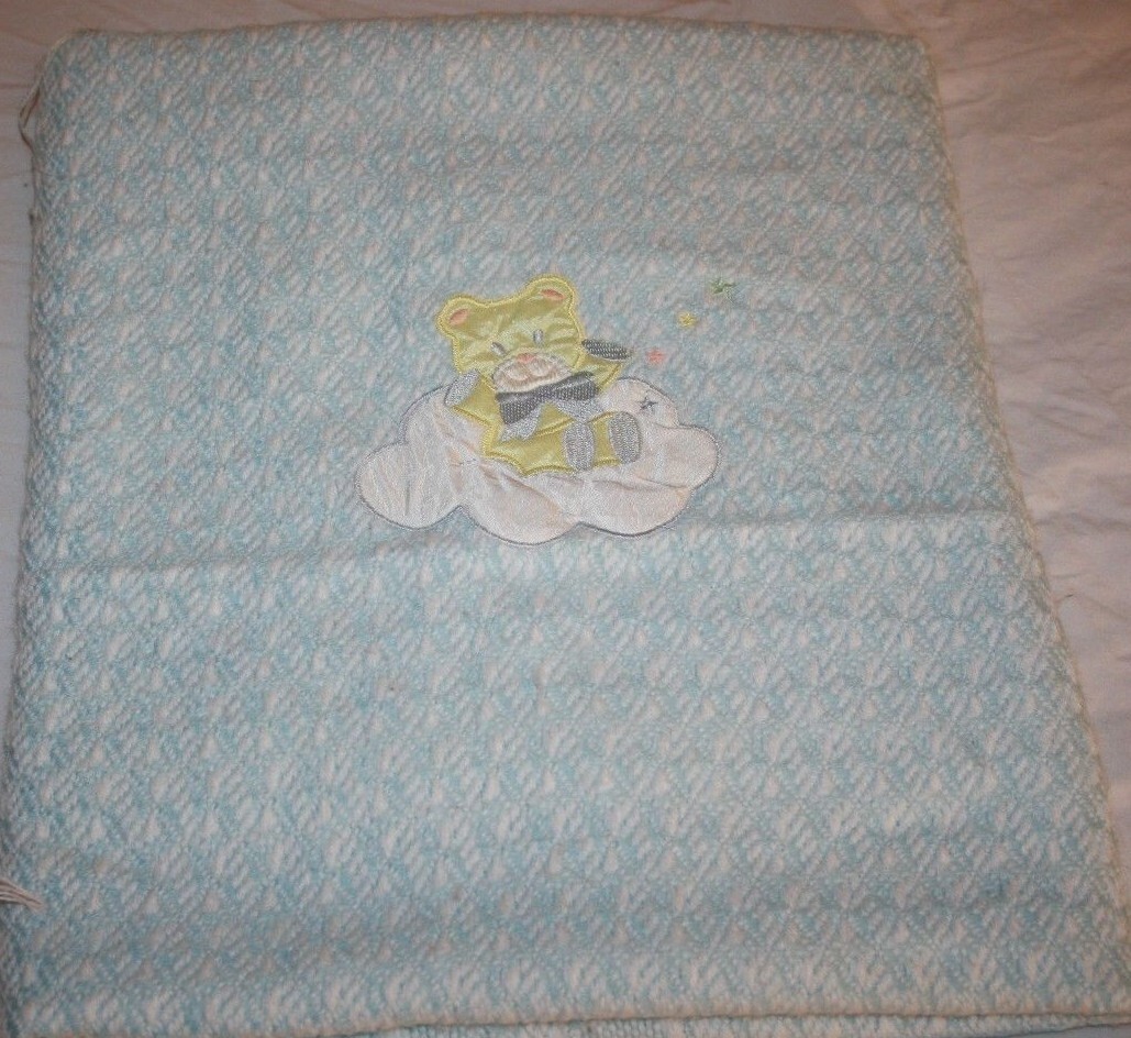 Teddy Bear Baby Blanket Clouds Stars Blue Acrylic Woven Yellow Applique Fringe