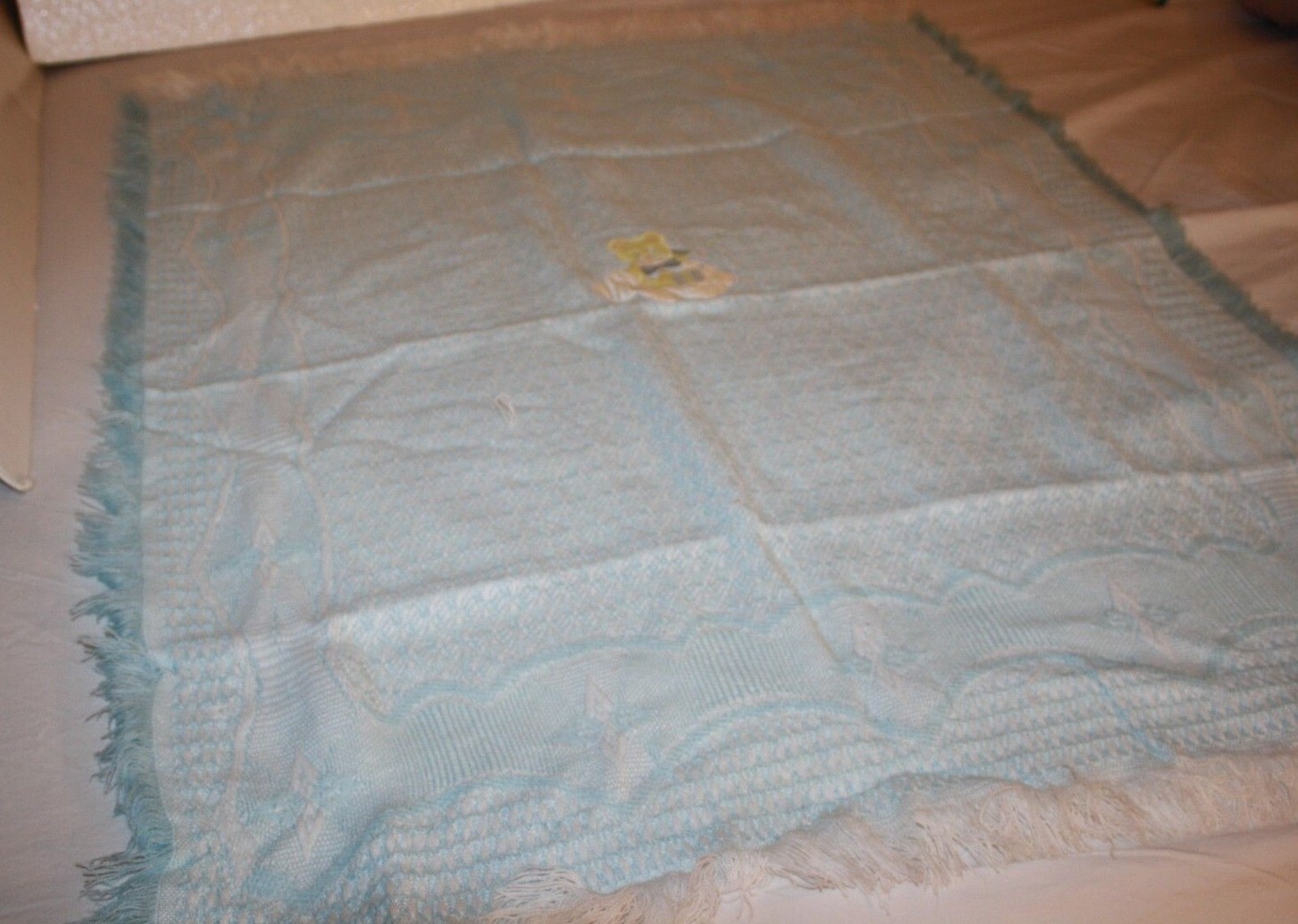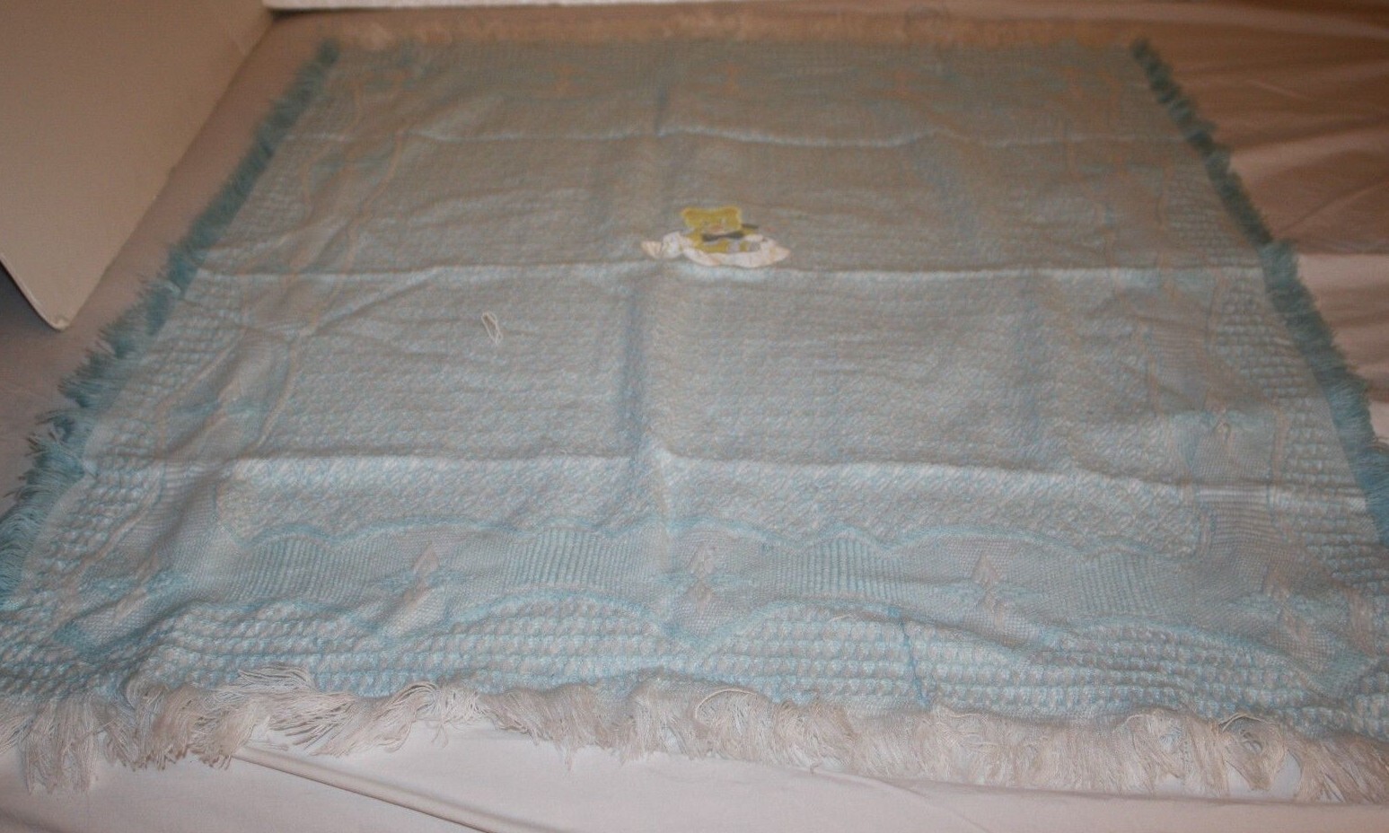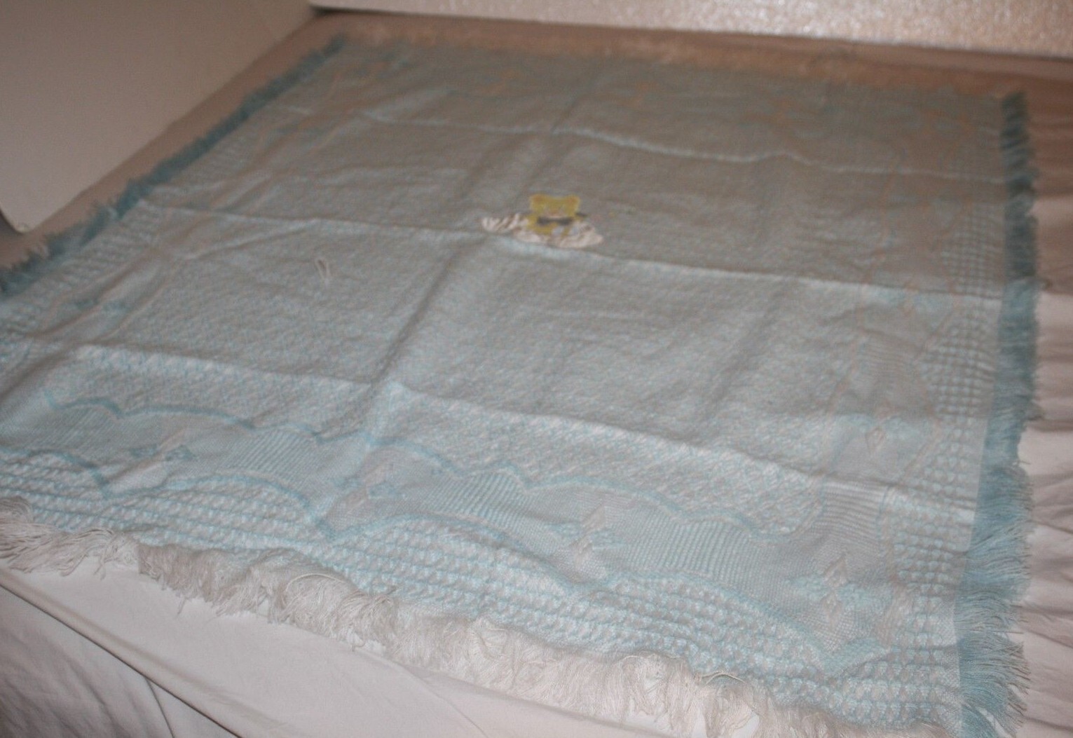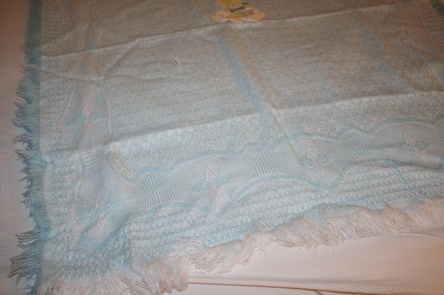 Teddy Bear Baby Blanket Clouds Stars Blue Acrylic Woven Yellow Applique Fringe