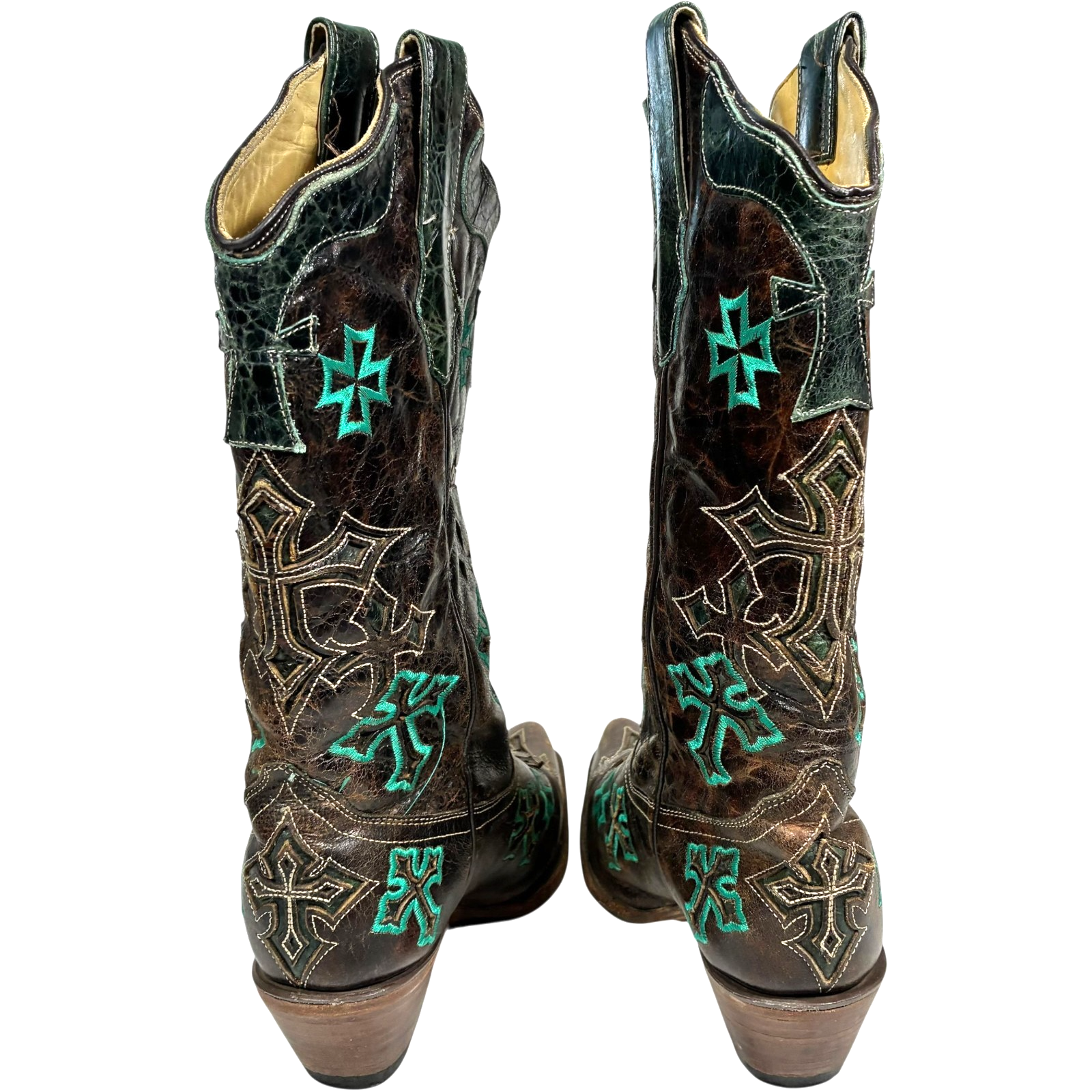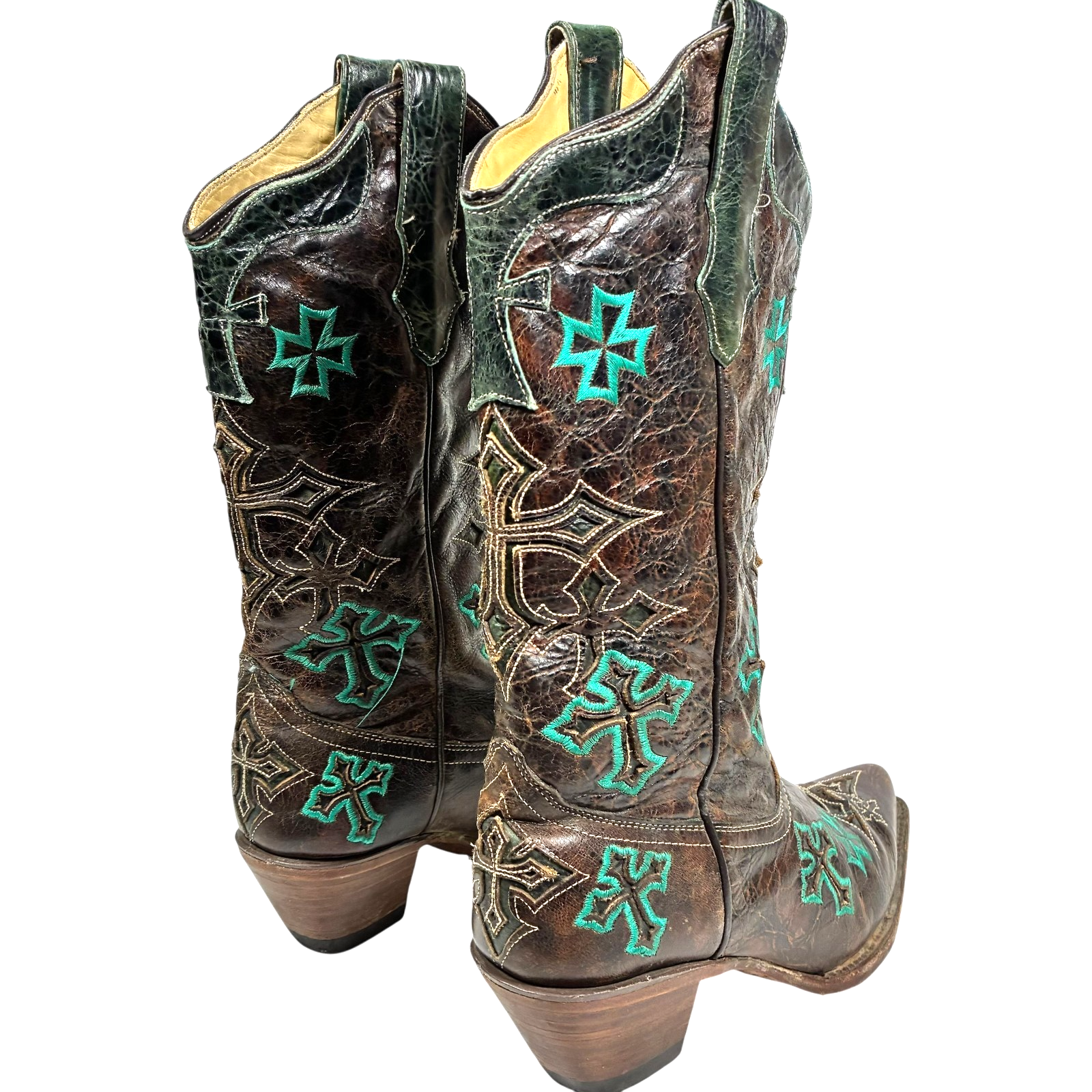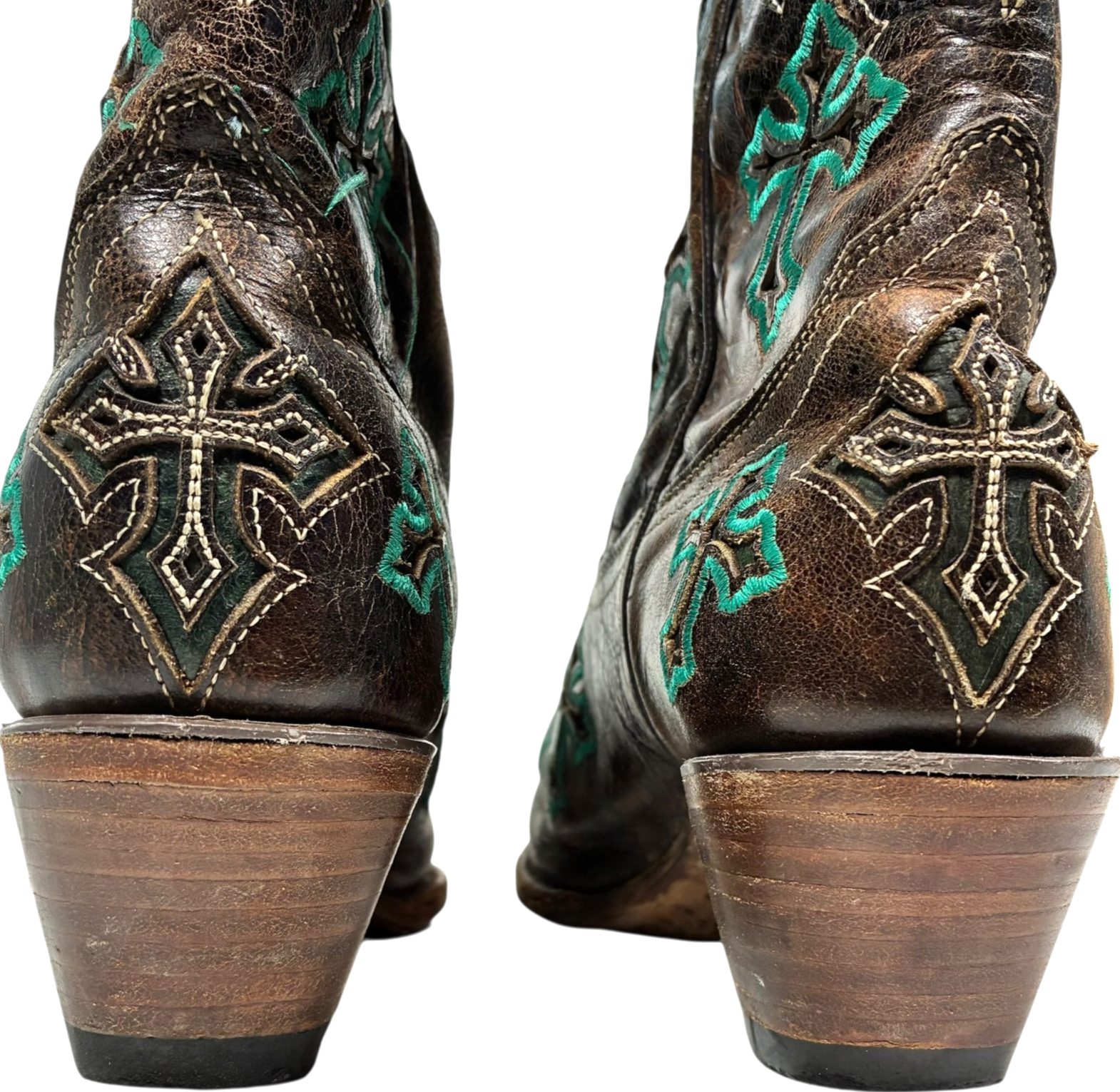 CORRAL R1019 Whiskey/Turquoise 3 Cross Snip Toe Cowgirl Boot women's size 8.5M