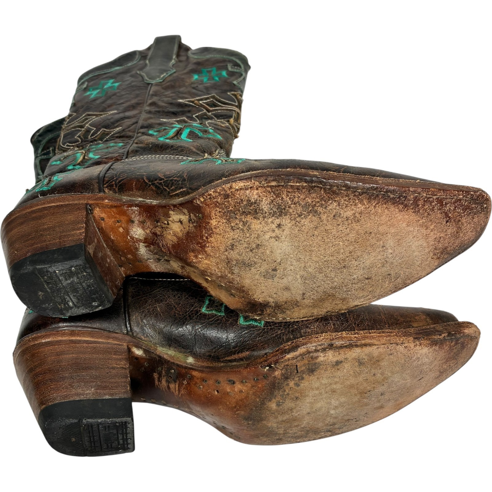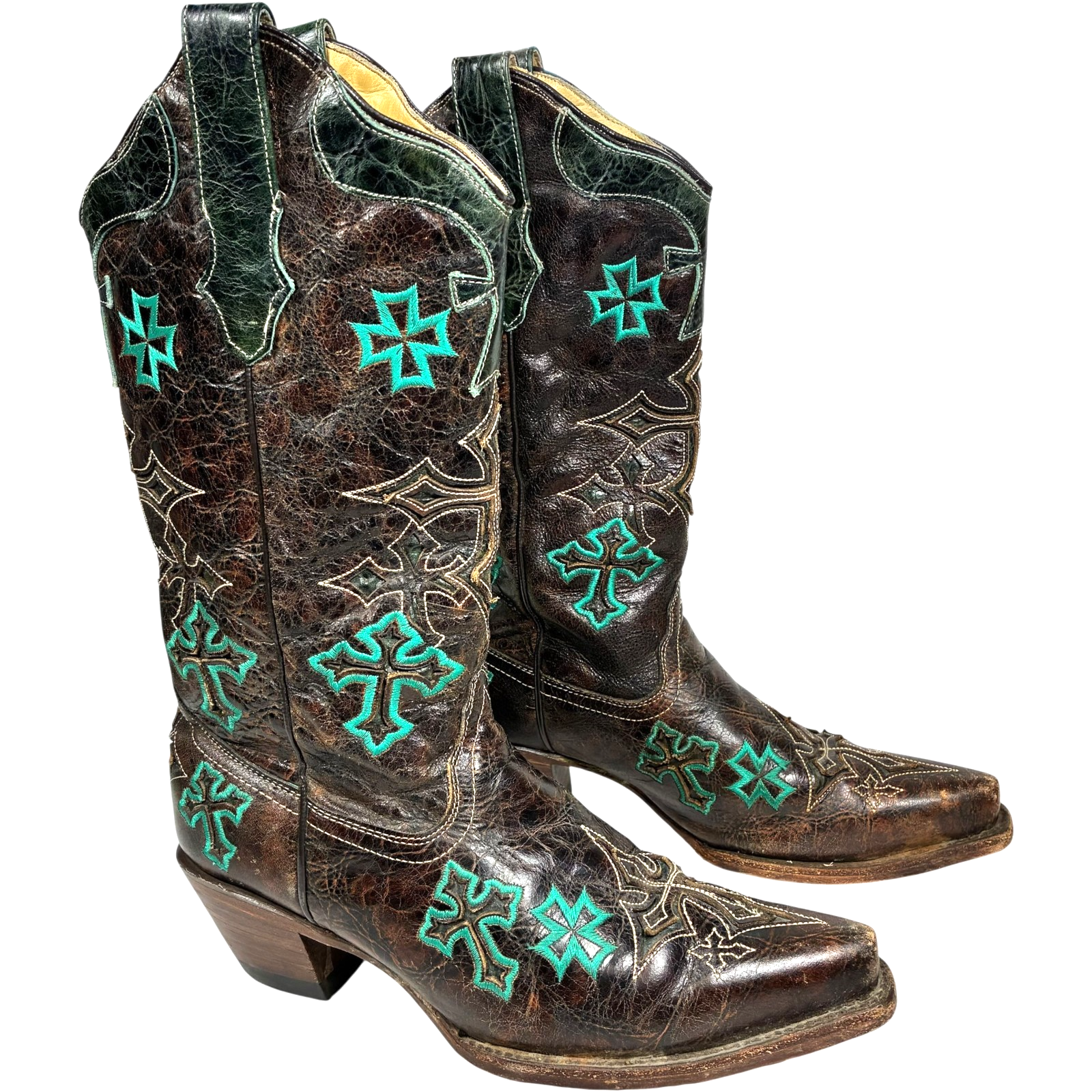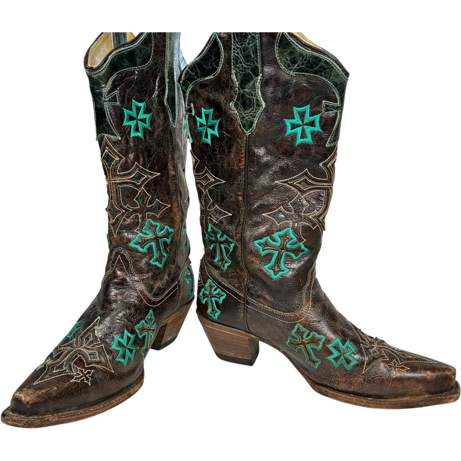 CORRAL R1019 Whiskey/Turquoise 3 Cross Snip Toe Cowgirl Boot women's size 8.5M