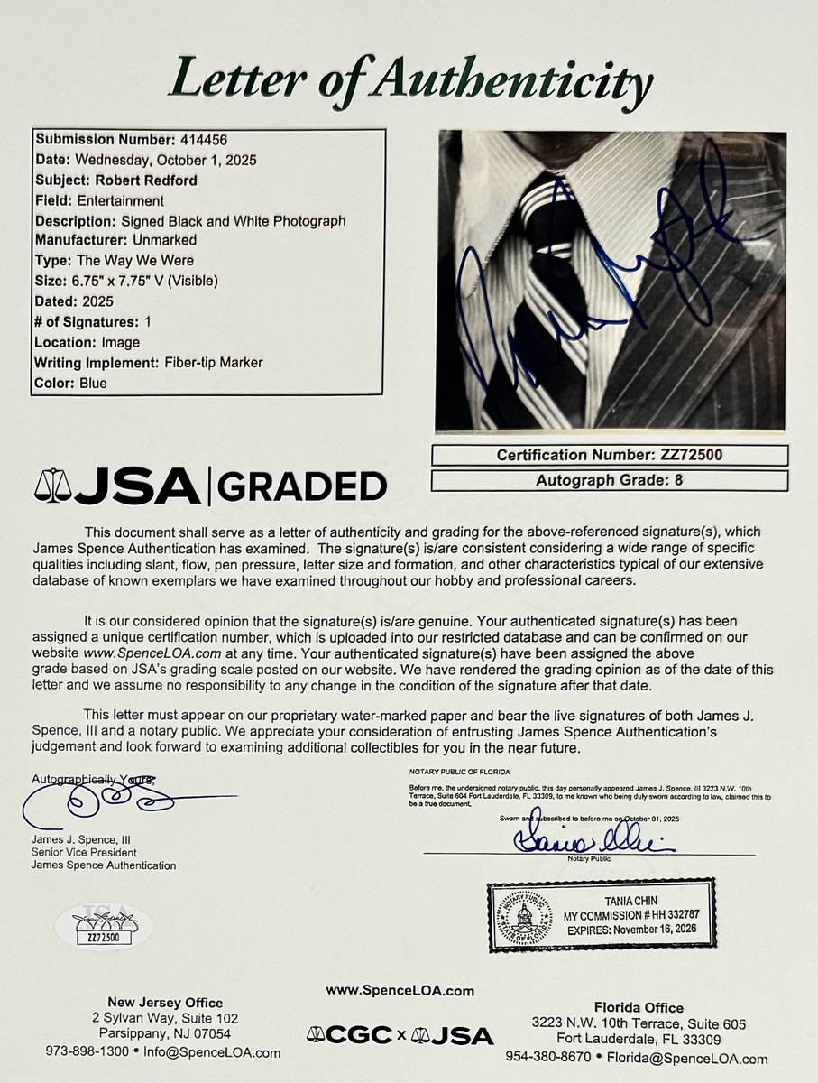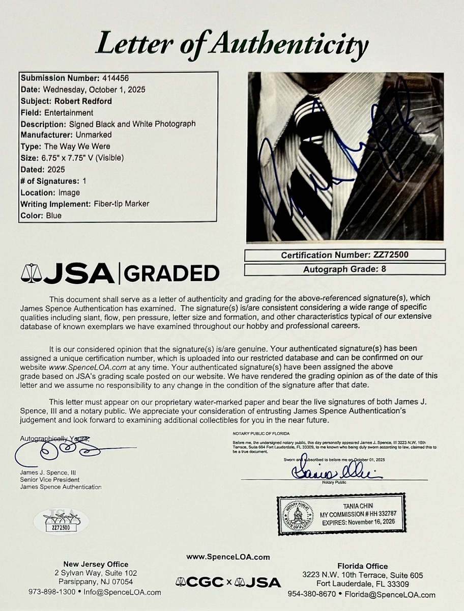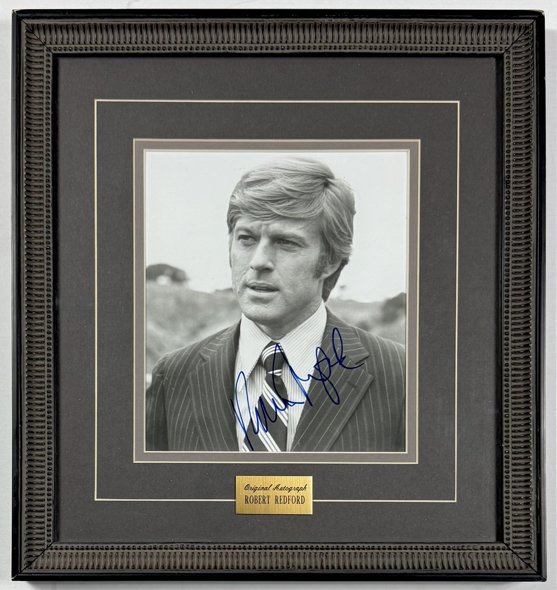 Handsome Robert Redford (August 18,1936 - September 6, 2025) autographed The Way We Were photo signed in blue fibre-tip marker. This signature has been authenticated by JSA James Spence authentication Certification Number: ZZ72500 and will come with the Letter of Authenticity you see in the scans. This photo is in the original frame from the Walt Disney store with the Walt Disney World Co authentication label on the backside. So you have double authentication on this wonderful item. This photo is most likely 8"x10" in size with 6 3/4" x 7 3/4" actually showing and framed to an overall size of 13 1/2" x 14 1/2" and is ready to hang. This is an older frame in good condition light wear with the backside the Disney authentication label having some paper loss as seen. Robert Redford was an American actor, director, and producer who has won an Academy Award, a BAFTA, and two Golden Globes. He first gained recognition for his stage and television work, and has delivered acclaimed film performances for over four decades. Redford is also known for founding the Sundance Institute, Sundance Film Festival, Sundance Village, and the Redford Center. Known for The Natural (1984), Ordinary People (1980), All the Presidents Men (1976), Butch Cassidy and the Sundance Kid (1969), Alfred Hitchcock Presents Charlie Marx (1961), The Twilight Zone Harold Beldon (1962), The Iceman Cometh (1960), War Hunt (1962), The Alfred Hitchcock Hour David Chesterman - Chuck Marsden 2 Episodes (1962-1963), Situation Hopeless -- But Not Serious (1965), Inside Daisy Clover (1965), The Chase (1966), This Property Is Condemned (1966), Barefoot in the Park (1967), Downhill Racer (1969), Tell Them Willie Boy Is Here (1969), Little Fauss and Big Halsy (1970), The Hot Rock (1972), Jeremiah Johnson (1972), The Candidate (1972), The Way We Were (1973), The Sting (1973), The Great Gatsby (1974), The Great Waldo Pepper (1975), Three Days of the Condor (1975), A Bridge Too Far (1977), The Electric Horseman (1979), Brubaker (1980), Out of Africa (1985), Legal Eagles (1986), Havana (1990), Sneakers (1992), Indecent Proposal (1993), Up Close Personal (1996), The Horse Whisperer (1998), The Last Castle (2001), Spy Game (2001), The Clearing (2004), An Unfinished Life (2005), Charlotte's Web (2006), Lions for Lambs (2007), The Company You Keep (2012), All Is Lost (2013), Captain America: The Winter Soldier (2014), A Walk in the Woods (2015), Truth (2015), One More Chance (2016), Pete's Dragon (2016), The Discovery (2017), Our Souls at Night (2017), The Old Man the Gun (2018), Buttons, A New Musical Film (2018), Avengers: Endgame (2019), Omniboat: A Fast Boat Fantasia (2020), and Dark Winds (2025). He produced 57 television shows and movies including Dark Winds (2022-2025), All Illusions Must Be Broken (2024), Death Row Stories (2014-2020), Public Trust (2020), The Mustangs: America's Wild Horses (2020), The Mustang (2019), The Old Man The Gun (2018), Be Natural: The Untold Story of Alice Guy-Blache (2018), Momentum Generation (2018), American Epic (2017), Our Souls at Night (2017), Arena (2017), The Big Bang (2017), American Epic (2016-2017), Ocean Warriors (2016), The American West (2016), The Confluence (2016), Look See: A Portrait of Wendall Berry (2016), Out of the Many, the One (2015), The Adderall Diaries (2015), A Walk in the Woods (2015), Chicagoland (2014), Cathedrals of Culture (2014), Drunktown's Finest (2014), The March (2013), All the President's Men Revisited (2013), Iconoclasts (2005-2012), The Company You Keep (2012), Watershed: Exploring a New Water Ethic for the New West (2012), The Conspirator (2010), Lions for Lambs (2007), The Unforseen (2007), The Motorcycle Diaries (2004), Coyote Waits (2003), People I Know (2002), A Thief of Time (2003), Skinwalkers (2002), Love in the Time of Money (2002), The Legend of Bagger Vance (2000), How to Kill Your Neighbor's Dog (2000), A Civil Action (1998), Slums of Beverly Hills (1998), The Horse Whisperer (1998), No Looking Back (1998), Central Station (1998), She's the One (1996), Grand Avenue (1996), Quiz Show (1994), A River Runs Through It (1992), Incident at Oglala (1992), The Dark Wind (1991), Yosemite: The Face of Heaven (1989), Some Girls (1988), The Miladro Beanfield War (1988), Promised Land (1987), The Solar Film (1980), and The Candidate (1972). Buy with confidence we have been selling autographs since 1992. This package will be professionally packed to arrive safely to you by FedEx Home Delivery with signature confirmation.