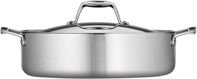 The Tramontina 6-Quart Tri-Ply Clad Stainless Steel Covered Braiser is designed with tri-ply construction, with an aluminum core between two layers of 18/10 stainless steel, the all-clad vessel ensures even heat distribution for better control over your dishes. Made without PTFE or PFAS for clean, efficient cooking. The easy-release surface makes cooking and cleanup a breeze. Ideal for slow cooking, braising, or searing, this cladded braiser can handle everything from tender roasts to rich sauces. Its stainless steel lid locks in moisture, while the short sides aid in reducing sauces. With a capacity to serve up to six people, it's perfect for family meals or entertaining guests. Oven-safe up to 500F and compatible with all cooktops, including induction, this braiser offers flexibility. The sturdy riveted handles ensure easy movement, even when full. Enjoy professional-quality results with every use, and trust its durable, elegant design to last for years. Dishwasher-safe for convenience.