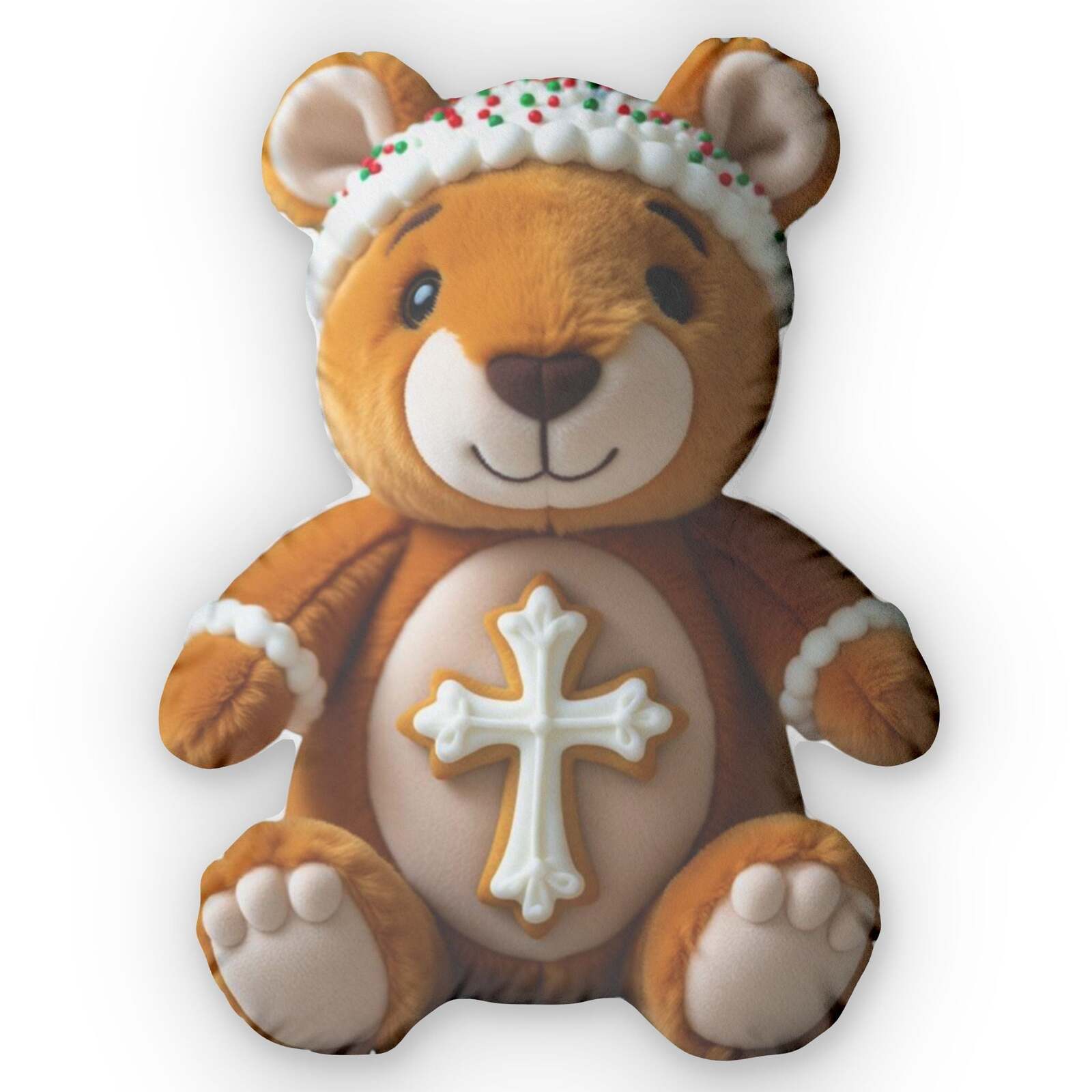 A unique, chestnut-brown capybara plushie pillow made from Christian-themed Christmas cookies, adorned with white icing crosses and festive red and green sprinkles. Perfect for adding a touch of whimsy and holiday cheer to your home decor, ideal for those who enjoy quirky and customized items. Great for Christmas decorations and gifts for animal lovers or those with a sweet tooth.