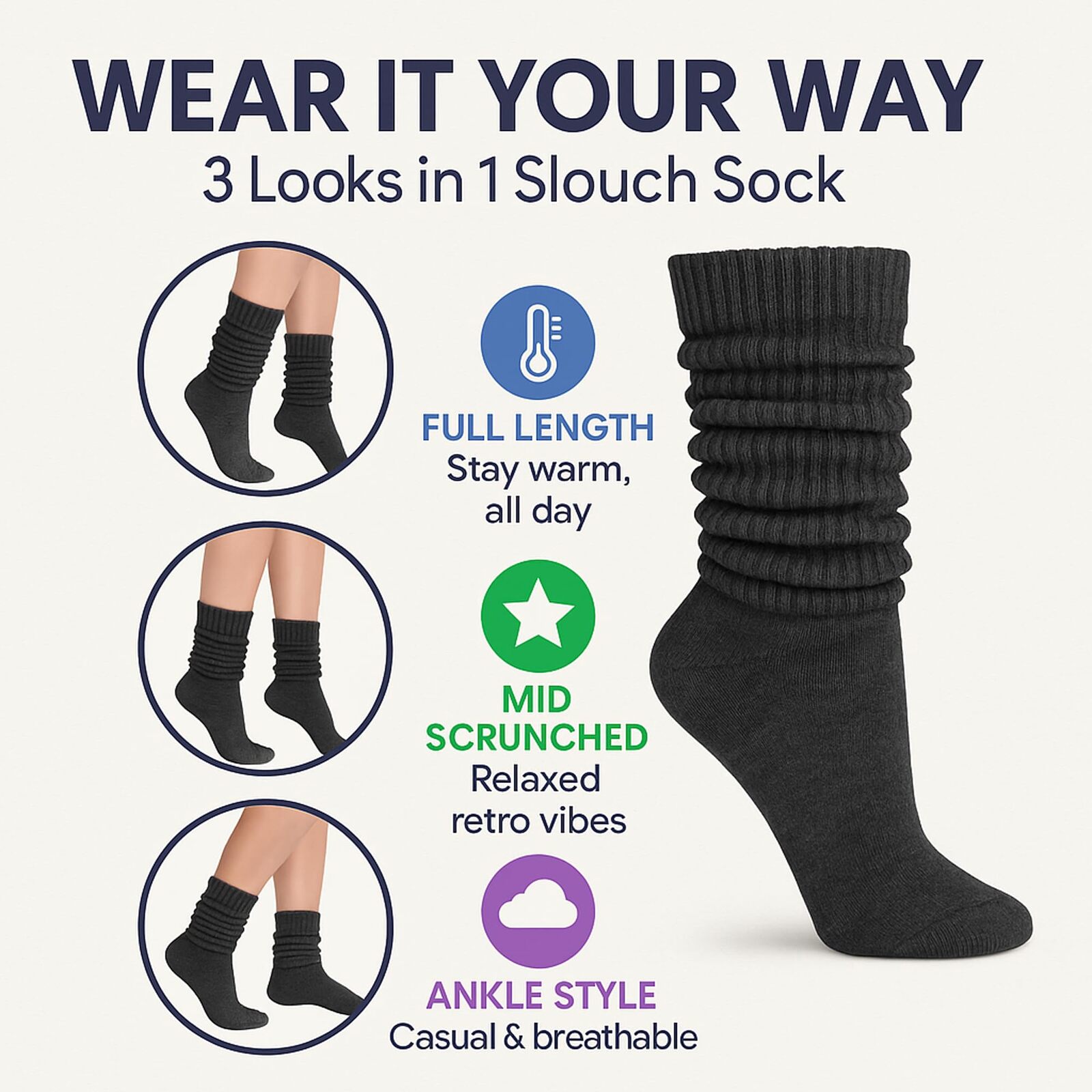 Product description: Step into a world of nostalgic comfort with ourSlouch Socks for Women Pack. AWS/American Made Slouch Socks Crafted with a blend of Cotton premium material, these socks offer a cozy and stylish addition to your wardrobe. Inspired by the iconic fashion of the '80s and '90s, these AWS/American Made slouch socks feature a classic ribbed design that adds texture and charm to any outfit. Whether you're lounging at home or hitting the streets, these Slouch Socks are the perfect accessory to elevate your look with a touch of retro flair. Designed for all-day wear, our slouch socks provide a comfortable fit that stays in place without feeling restrictive. The soft and breathable fabric ensures your feet stay cozy and dry, while the slouchy silhouette adds a relaxed vibe to your ensemble. Available in a variety of colors to suit your style, these socks are a must-have for any fashion-forward woman. Treat yourself to the timeless appeal of our Retro Ribbed Slouch Socks and step out in confidence wherever you go. Slouch Socks for Women; Retro-inspired design, Premium blend for comfort and durability, soft texture for added style.