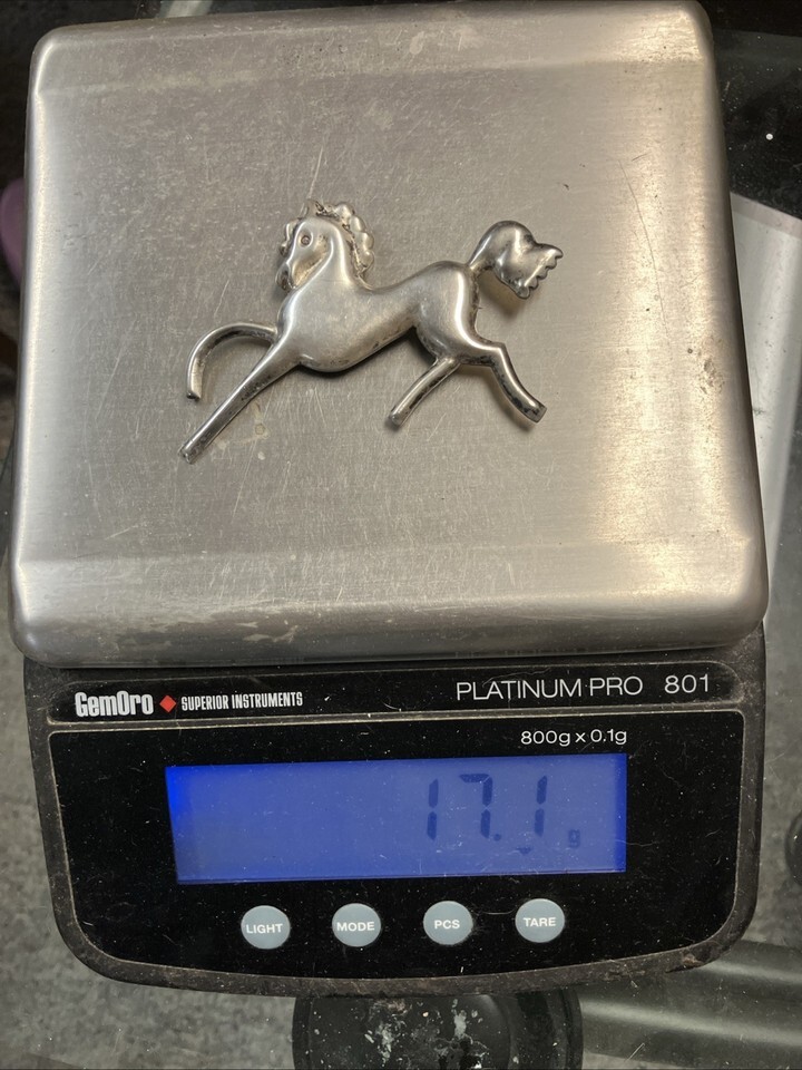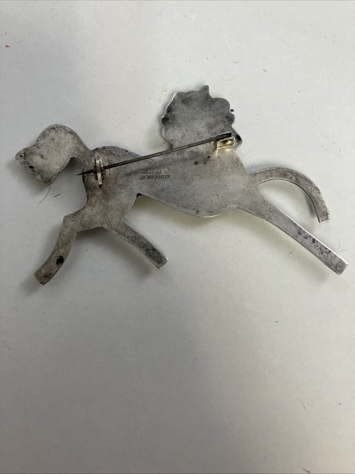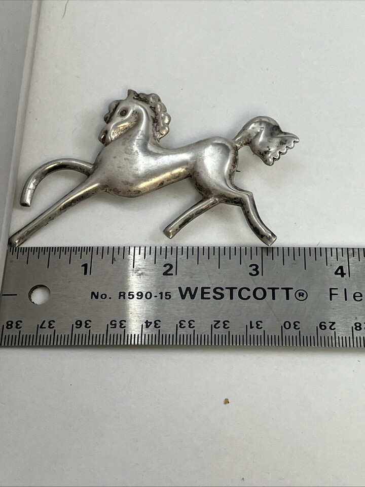 Vintage 1940s Mexican sterling silver horse pin, measuring 3.5 inches in length and weighing 17.1g. The pin features a prancing pony design, showcasing the intricate craftsmanship and unique style of Mexican jewelry from that era. This brooch is a beautiful and stylish accessory that would make a great addition to any collection of vintage jewelry, particularly a collection with a Western theme or horses.