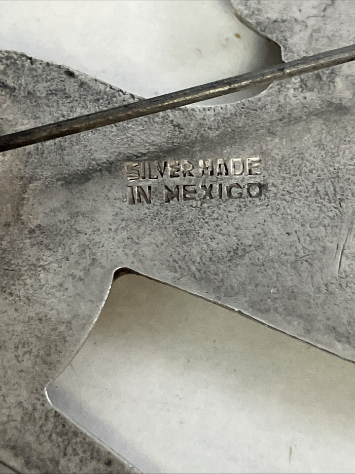 Marked ?Made in Mexico Silver? on back. We have no idea of silver content (%) but scratch test yields a blue tint indicating some level of silver content, likely lower.