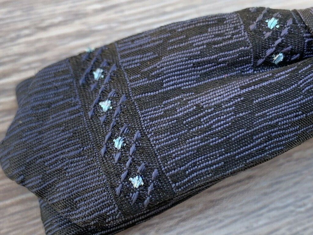 Wembley vintage men's 1940's clip-on rayon bow tie with very cool blue dashes print with ice blue thread dots. Width is 1.25". Length is 5" with a 2.5" metal clip marked Wembley. Good used condition with slight tarnish on the clip.