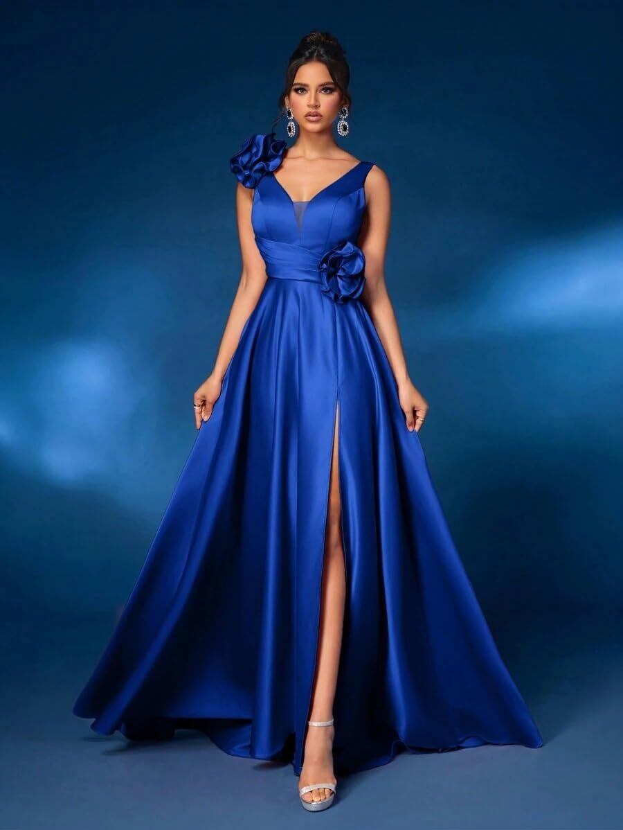 Product description: Make a stunning entrance at your next formal event with this elegant A-Line dress from TRENDY TRON. Featuring a flattering V-neck design and eye-catching 3D floral details, this maxi-length gown exudes sophistication and grace. The high-waist silhouette and dramatic high slit create a captivating look that's perfect for weddings, graduations, and dinner parties. Available in twelve gorgeous colors including Apricot, Green, Hot Pink, Purple, Royal Blue, and Navy Blue, there's a shade to complement every style preference. The sleeveless design and backless feature add a touch of allure, while the beautiful train creates a memorable silhouette. Crafted from 100% polyester with matching lining, this regular-fit dress combines comfort with high-end style. The convenient zipper closure ensures easy wear. Hand wash recommended to preserve the dress's exquisite details.