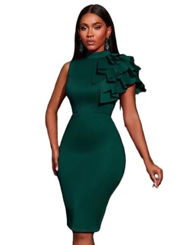 Product description: Elevate your formal wardrobe with this stunning Trendy Tron Elegant Ruffle Trim Mock Neck Dress. Perfect for parties, weddings, and special occasions, this sleeveless midi dress features a sophisticated stand collar and eye-catching ruffle hem details that add a touch of feminine flair. The bodycon silhouette with a high waist and pencil hem creates a flattering slim fit that accentuates your curves, while the slight stretch fabric ensures comfortable movement throughout your event. Available in striking Hot Pink and Dark Green, and in sizes S through XXL, this unlined dress combines style with versatility. The plain pattern design offers timeless elegance that pairs beautifully with your favorite accessories. Crafted from 95% Polyester and 5% Elastane, this dress provides the perfect balance of structure and comfort for those memorable evening occasions.