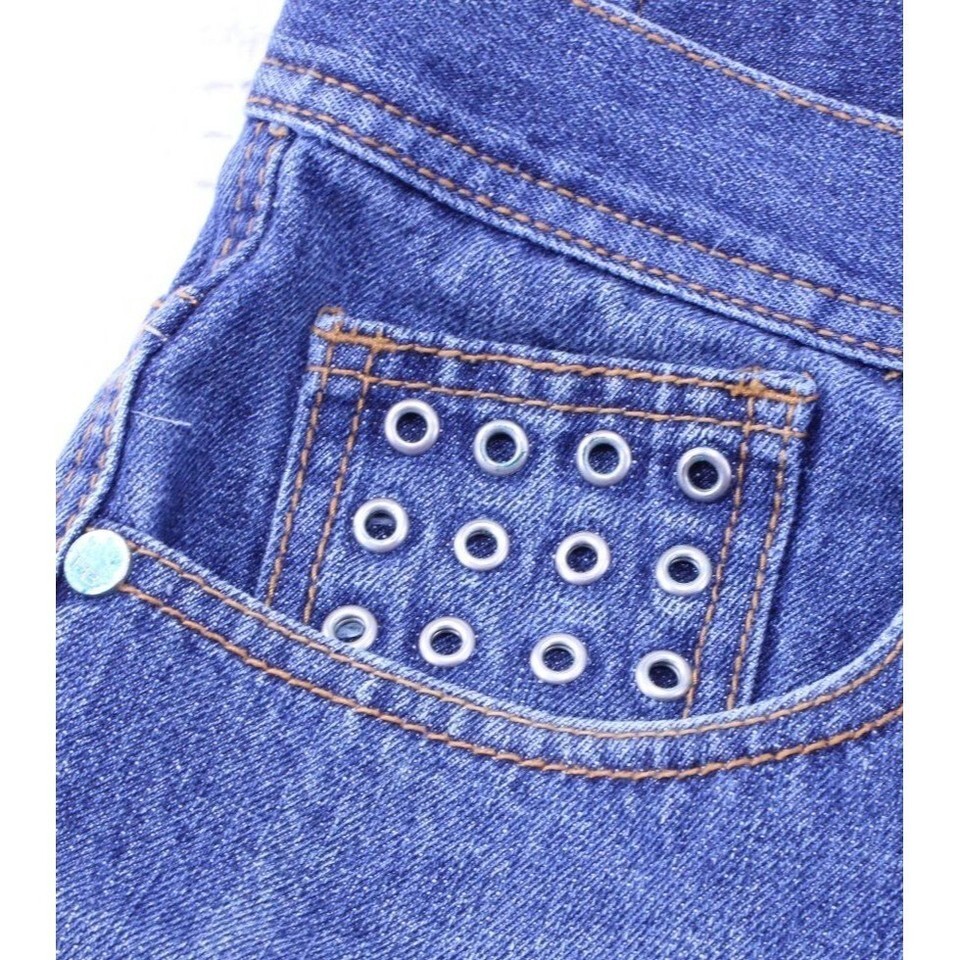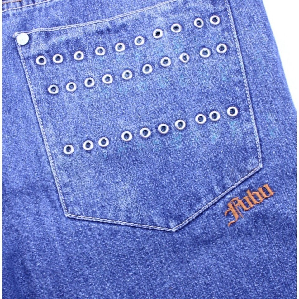 These Fubu denim jean shorts offer a classic vintage look with a modern twist, featuring a unique metal studded pocket design. Ideal for casual wear.