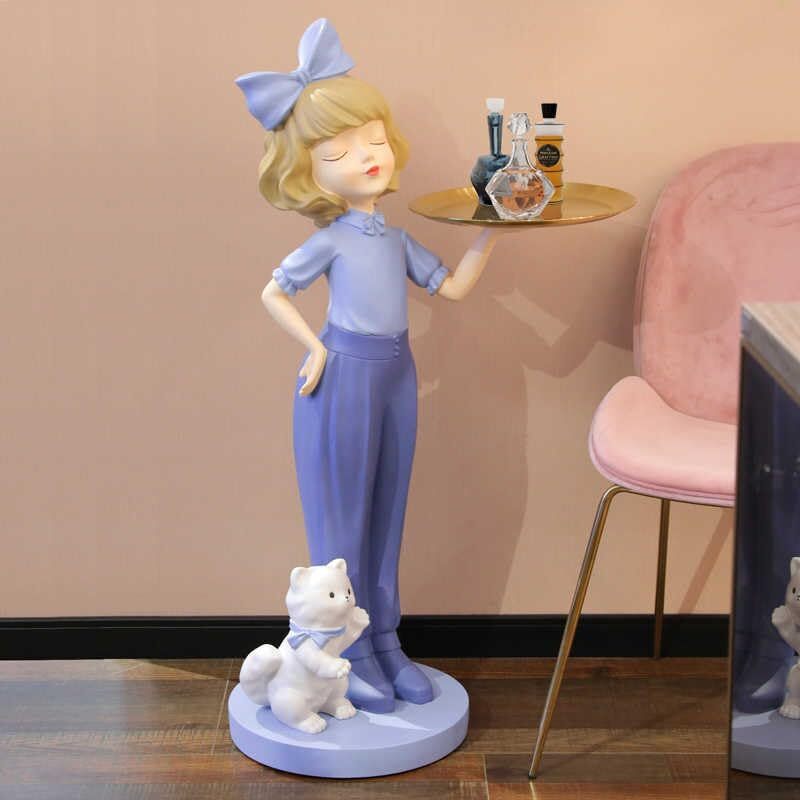Product description: This charming 110CM-tall modern sculpture features an adorable girl with a butterfly bow holding a removable golden tray, accompanied by a playful cat companion. Crafted from high-quality resin with a smooth gloss finish and rounded edges, this statement piece combines functionality with whimsical design. The versatile tray serves as a perfect spot for keys, snacks, or decorative items. Standing at approximately 48x40CM (large size), this light luxury Nordic-style statue makes an elegant yet playful addition to any space. Its sturdy round base ensures stability in high-traffic areas like entryways, beside sofas, TV cabinets, living rooms, offices, or hotel receptions. The sculpture's childlike details?featuring a big bow and soft facial lines?create a welcoming atmosphere while adding a touch of sophisticated whimsy to your decor.