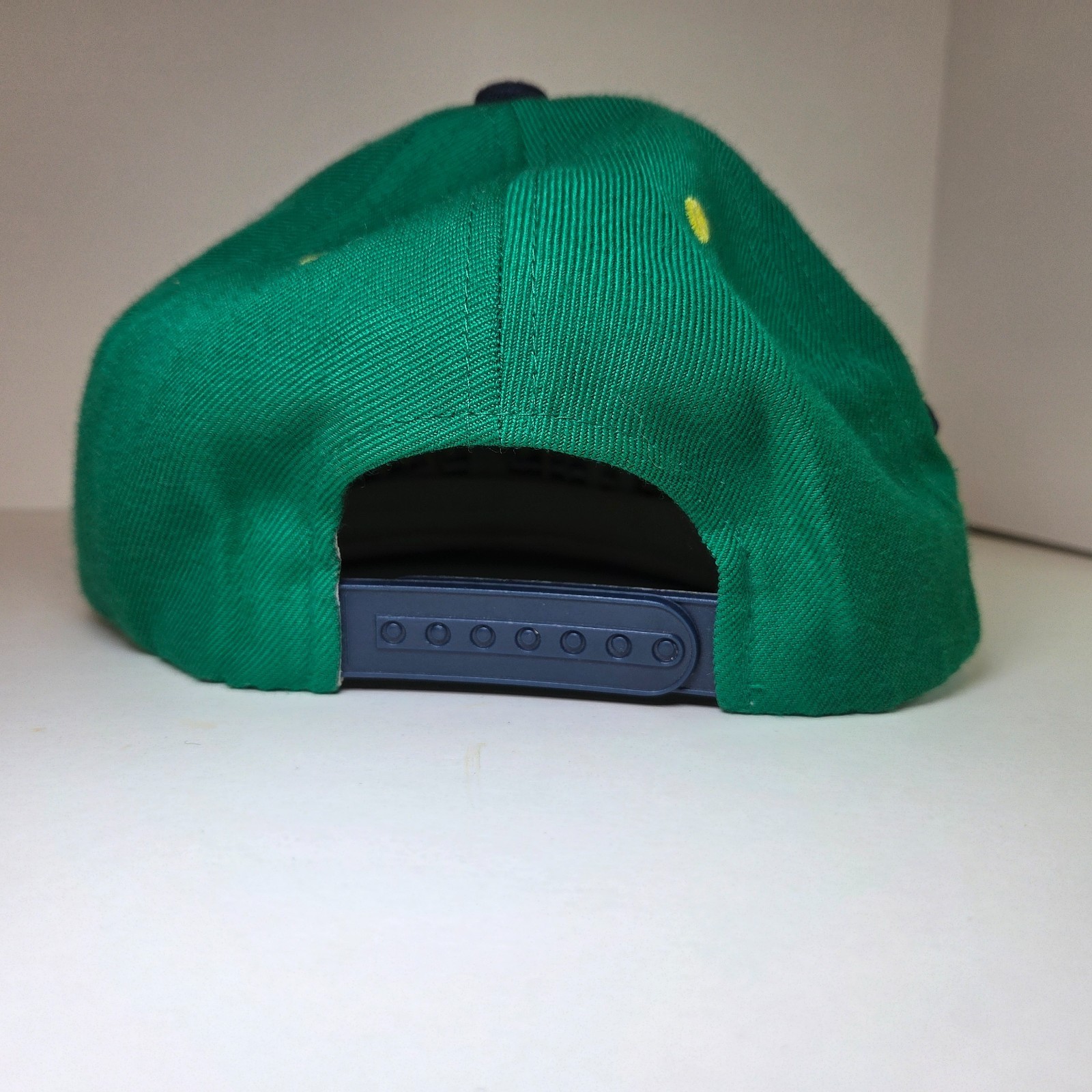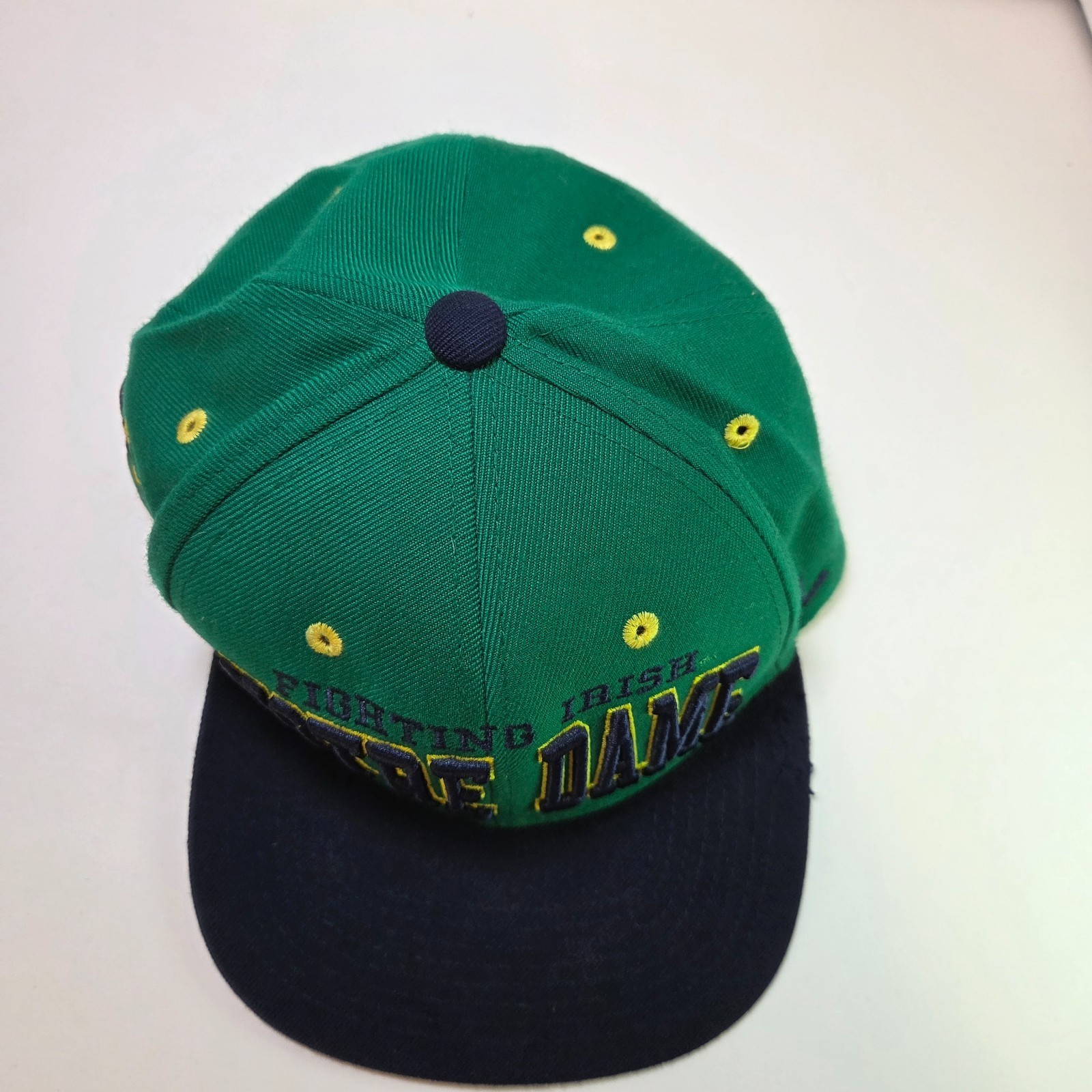 Vintage Notre Dame Fighting Irish snapback cap by Zephyr, featuring bold embroidered lettering and side leprechaun mascot graphic. Classic green and navy colorway with yellow accent eyelets. Marked as ?The Z Hat? with 1993 est. tag. This hat has heavy wear on the brim and interior but remains a solid piece for any Notre Dame fan or vintage NCAA hat collector. See all photos for condition details.